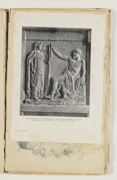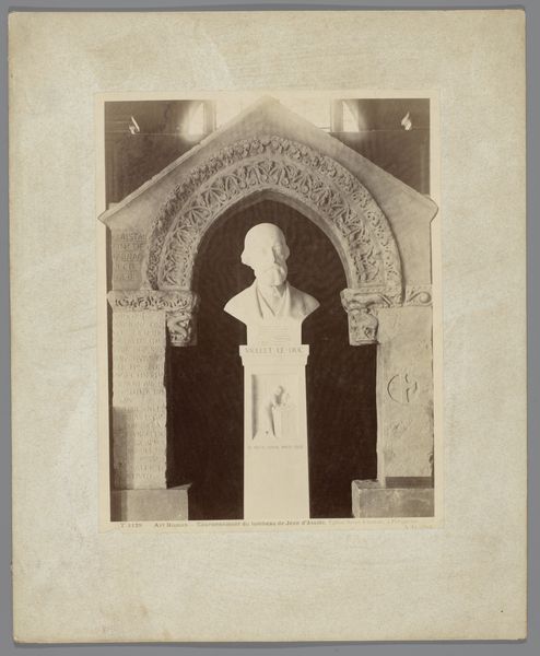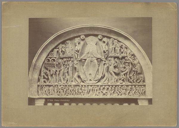 Curator: Laurens Lodewijk Kleijn, known for his photographic studies, created this work, a "Photographic Reproduction of a Stone Relief," sometime between 1865 and 1900. What catches your eye first, I wonder? Editor: Oof, the starkness. It’s like a dream trying to hold onto reality. The greyscale gives it an ethereal quality, but then the sharp lines of the relief cut through. It feels... weighty, somehow, despite being just an image. Curator: Indeed. Observe the subject: a robed figure standing beneath an elaborately decorated archway, flanked by what appear to be stylized columns. The composition is strikingly formal, adhering to a symmetrical balance, though slightly disrupted by the damage at the left. Note the detail of the drapery and the architectural elements. Editor: Right, like somebody pressed a pause button on history. It's beautiful, but makes me want to imagine what kind of story it's hinting at, y'know? The setting, this archway. And what’s she holding up? There's a subtle drama there. Makes you question the narrative that was once there. Curator: Consider also the artistic merit beyond documentation. Kleijn's deliberate choices of lighting and perspective serve to emphasize the textures and depth of the original stone carving, translating three-dimensionality into a two-dimensional medium with skill. Editor: Totally! I also like how this image is partly ruined, in a way: what is present is not only about its initial conception but time passing, which always alters meanings and relationships in unexpected directions. Curator: That's a valid point. What remains hints at the original form, but creates a sense of fragmentation and lost context as well. Kleijn captured not just the image but also time’s effect, quite beautifully. Editor: So true, which speaks volumes to this very particular piece. Thanks! Curator: My pleasure. Thank you for sharing those brilliant reflections.