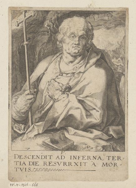 Editor: We're looking at Hendrick Goltzius' "Apostlen Filip" from 1589, an engraving printed on paper. The fine lines of the engraving give a somber feel to the Apostle's portrait. The way light and shadow define the Apostle Philip's features is remarkable. How do you interpret the formal composition of this piece? Curator: Observe how the artist meticulously employed line weight and density. Notice the varied hatching to modulate the Apostle’s garments, compared to the lighter touch on his face. See the contrasting textures and tones, and the semiotic potential unlocked in the relation of form to content. Consider, also, the implied symbolism. The cross, prominently displayed, operates as a formal anchor, and provides compositional balance to the lower register and the book below. How do these forms affect our interpretation of the piece? Editor: So, it’s about the relationships within the engraving itself – the interplay of lines, forms and composition, rather than necessarily external historical elements? Curator: Precisely. The power of this engraving resides in the artist's command of form and its relationship to thematic significance, its skillful translation of three-dimensional volume into a two-dimensional space. External context serves only to confirm visual understanding of form. Editor: I see it now! Focusing on those visual relationships, rather than rushing to a symbolic meaning, has helped me appreciate the artist’s skill so much more. Curator: Indeed, by engaging with the materiality and the forms, new pathways for meaning are uncovered and unveiled.