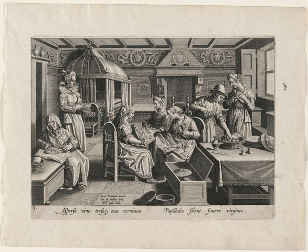 Curator: Look at this print! It's called "Boeren en de Landheer," or "Peasants and the Landlord," made between 1778 and 1785 by Noach van der Meer the Younger, and we are so fortunate to have it here at the Rijksmuseum. Editor: Oh, my first impression is one of slight tension! There's this almost performative authority radiating from the landlord, countered by what appears to be some skepticism from the peasants. Curator: Yes! He’s definitely the focal point. What's striking is van der Meer's use of line—the etching is incredibly detailed. The light streaming through those arched windows on the left contrasts starkly with the landlord’s assertive stance. Editor: That pose! Pointing, leg slightly forward. He embodies the power dynamics so characteristic of that period. It reads so vividly in our current sociopolitical climate, where land ownership and resources continue to be points of conflict. What exactly is the 'Keur' or official order pinned up on the back wall saying? Curator: Oh! Good eye! It probably outlines local ordinances and regulations, solidifying the landlord’s power even further. I can almost hear him reading it out loud and them groaning... metaphorically of course. I can really imagine the sounds. Editor: The print captures the intersection of local governance, power dynamics, and resistance, or at least, reluctant compliance, as displayed in the peasants' faces. There's this undeniable social commentary threaded throughout the print. Who really holds power, and is it always absolute? Curator: You know, it's almost a snapshot of everyday injustice, made enduring through art. I love how it makes us question these historical figures. The composition is really intimate. Like a fly-on-the-wall moment. Editor: Yes. Van der Meer creates a dialogue that invites us to really analyze the intricacies of hierarchy, power, and community relations. I love the nuance of each etching line that conveys a powerful message which is as relevant now as it was centuries ago. Curator: I hadn't thought about it quite like that. Thanks. It makes me appreciate the artistry and impact of even seemingly simple scenes. Editor: Absolutely. Art is never just "art." It’s always engaging with history and with each other, whether we intend it to or not.
