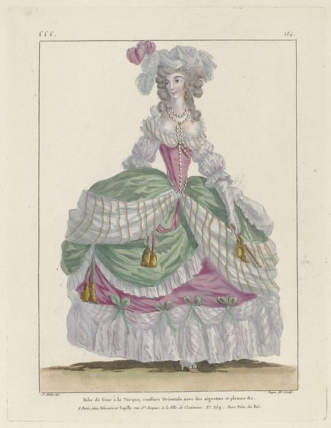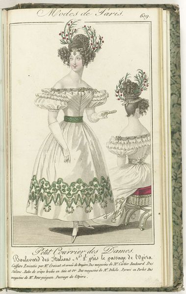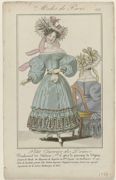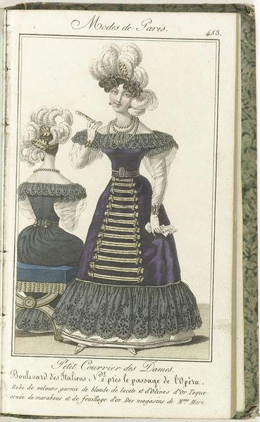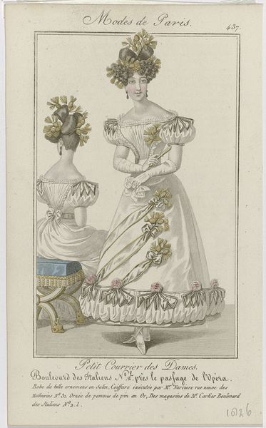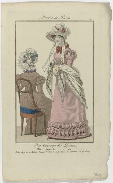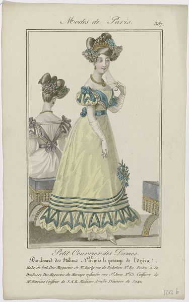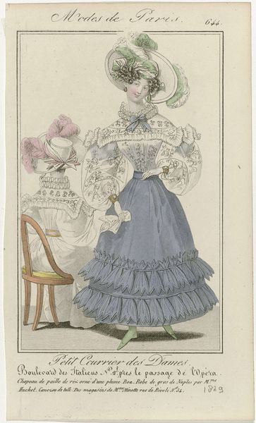 Editor: Here we have an image entitled "Petit Courrier des Dames," number 133, created in 1823. It appears to be a watercolor print showcasing women's fashion. It feels quite opulent, almost excessively so, focusing heavily on the details of the dress fabric and lace. What stands out to you about this piece? Curator: This print provides fascinating insights into the material culture of the early 19th century. Beyond the aesthetic, consider the production. These detailed fashion plates weren't mass-produced in the modern sense. Think about the specialized labor involved - the paper-making, the textile production, the engraving and printing process, the hand-coloring... Each stage implicates a network of workshops, skilled artisans, and the social hierarchies that governed their access to resources. How does viewing it through this lens change your understanding? Editor: It definitely shifts my perspective. I hadn't really considered the sheer number of people involved in even creating something like this, that's intended as a kind of ephemeral promotional material. I guess I thought of it as more individual work. Curator: Precisely. And consider the audience for whom these images were made: affluent women with the purchasing power to acquire these luxury goods and a leisure class position to occupy such a time-intensive pursuit of personal display. What are the implications of consumption for that social strata in France in the 1820s? It reinforces their status, differentiates them from the working classes, and perpetuates a system of economic disparity. Editor: That’s really interesting! So it’s not just a pretty picture, but also an advertisement reflecting specific labor practices, consumer habits and a reinforcement of existing social structures. Curator: Exactly. By analyzing the materials, the means of production, and the social context surrounding its consumption, we gain a deeper understanding of the power dynamics embedded within seemingly frivolous fashion plates. Editor: Thanks, I'll never look at fashion plates the same way again. I see how much they can tell us!