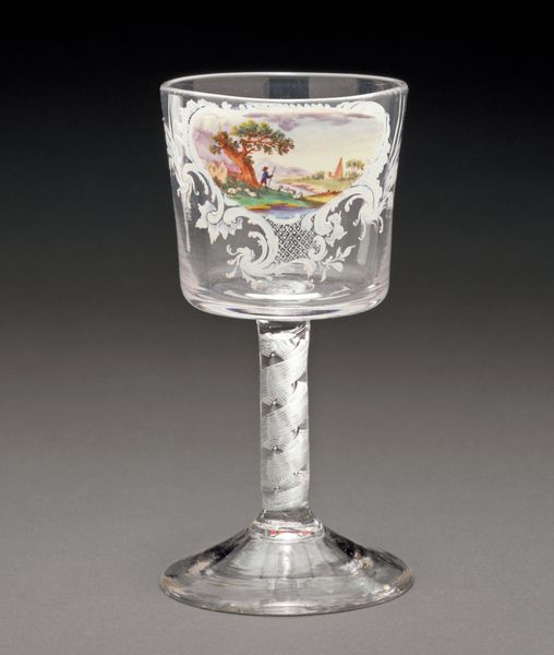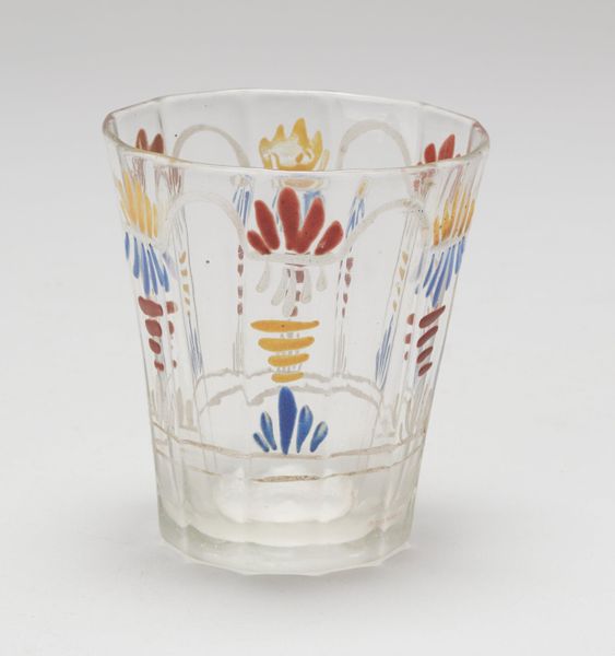 Editor: This is a small beaker, dating back to 1739. It's made of glass, decorated with enamel. What strikes me is its whimsical, almost naive design, featuring colorful but simple motifs. What do you see in this piece? Curator: I see a reflection of the decorative arts of the Baroque era, but also hints of the social strata within which it functioned. Consider that enamelware, while decorative, was also about displaying a certain status. Editor: How so? Is it because only wealthy people could afford such nice beakers? Curator: Not just afford, but perhaps more importantly, value this level of crafted display in everyday objects. This piece signals access, but also a specific set of cultural values tied to presentation and refinement – things often dictated along gendered and class lines. It raises questions about who had access to beauty, and whose stories are told through these objects. Editor: So, even something as simple as a beaker can be a commentary on social hierarchy? Curator: Absolutely. It’s crucial to consider objects like this as products of a specific time and place, reflective of the power dynamics that shaped them. Who was pouring what into it? Who was washing it, who decided on the pattern, and for whom was it created? Those answers expose many issues. Editor: That's a very interesting way to look at it! I'll never see glassware the same way again. Curator: That's my hope – that this piece allows us to question not just its aesthetic qualities but its role in a much broader social narrative.