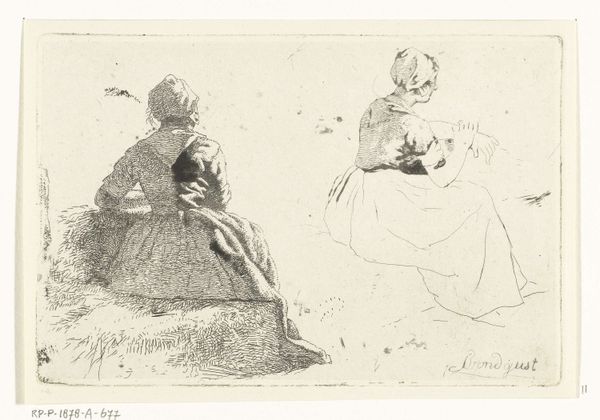 Curator: This pencil drawing from between 1796 and 1849 by Albertus Brondgeest is called "Two Figure Studies of a Peasant Woman Seated on a Hay Bale." Editor: My first impression is one of starkness. The image is defined by the sharp lines of the pencil work, it conveys a quiet, perhaps burdened mood, accentuated by the subject turning away from the viewer. Curator: Turning away, indeed, which adds to the symbolic weight of the woman, doesn't it? She embodies a kind of enduring, almost mythic connection to the land and cycles of labor. The averted gaze perhaps suggesting introspection, or a resistance to being easily understood. Editor: And note how the hay bale isn't just a seat; Brondgeest has carefully constructed it with layered pencil strokes, demonstrating the dense, tactile quality of the material itself, almost emphasizing the physicality of rural life, of manual work. Curator: Absolutely, it grounds her, doesn't it? The contrast between the solidity of the hay bale and the more fluid depiction of her figure invites us to contemplate the intersection of permanence and transience within the peasant experience, how the land endures but individual lives are ephemeral. There’s almost an archetypal mother quality here, linked to the cycles of harvest and regeneration. Editor: Consider the economics embedded: Paper and pencil, relatively inexpensive, making art accessible. This medium facilitated the mass production of imagery for broader consumption. Curator: It moves me how Brondgeest uses a readily available medium to tap into something timeless and universal about the human condition. Through minimal means, we are reminded of an age-old dependence on the soil. It is beautiful. Editor: Yes, seeing the artwork from this point also underscores the transformative effect artists exert when depicting simple tools and scenes in their surrounding material reality, which helps the ordinary speak.