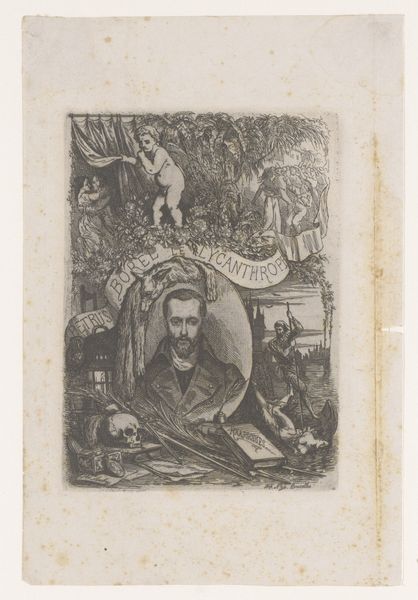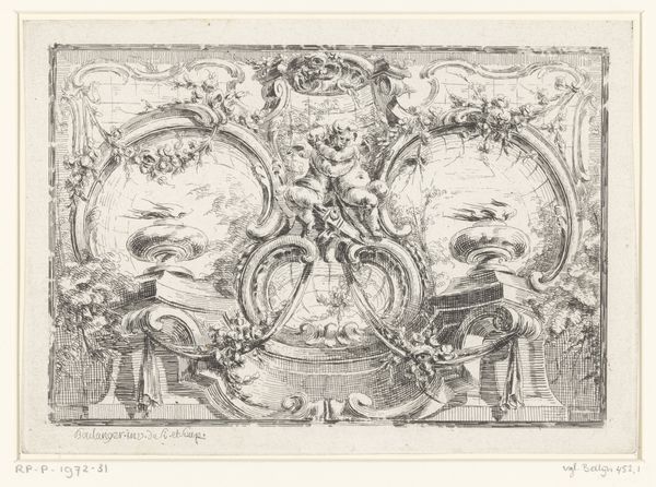 Curator: Looking at this piece, I’m struck by how ornate and crowded it is, yet it all somehow balances. What do you see at first glance? Editor: The light and dark play, that's what grabs me immediately. There’s a deep sense of symbolic division and hierarchy – like looking at two different worlds attempting communication. It's Baroque at its finest in its pursuit of capturing maximal sensory experience. Curator: Indeed. What we are looking at here is the title print for Andreas Cellarius’ “Harmonica Macrocosmica seu Atlas Universalis et Novus”, made somewhere between 1660 and 1708 and engraved by Frederick Hendrick van den Hove. This engraving would have prefaced an atlas, a kind of ‘greatest hits’ of celestial and terrestrial cartography at the time. Editor: An Atlas as a frontispiece – quite fitting. I notice the figures on the right – learned men, astronomers perhaps – reaching with a measuring rod towards putti who bear a book. It speaks to knowledge being literally passed on, almost as if it’s divine in origin. I find myself drawn to the presence of these geometric forms representing celestial knowledge and understanding – the bridge between the sacred and the empirical, very indicative of this period's shifting consciousness. Curator: Absolutely. There’s the terrestrial, scientific knowledge we gather, illustrated through earthly astronomers. And on the other side, those chubby cherubs afloat in cosmic ether, representing celestial or divine knowledge, pulling back. It shows the changing times, that balance is off. Editor: Yet that delicate measuring rod, the only connection in this divided composition, seems so tenuous. A whisper bridging eons. Is it optimistic or cautionary, this allegory? A yearning for a unity of knowledge, maybe lost, or on the verge of being found? Curator: I suppose it’s open to interpretation. The image seems caught in a moment of tension. It speaks of that pivotal shift, between the sacred understanding of the universe and the birth of empirical science and how uneasy and awkward the transaction sometimes could be. Editor: Yes, that tension makes this far more compelling than mere decoration. The title page becomes a doorway, doesn’t it? An invitation, but also a question. Fascinating.
