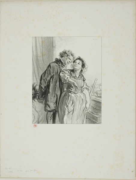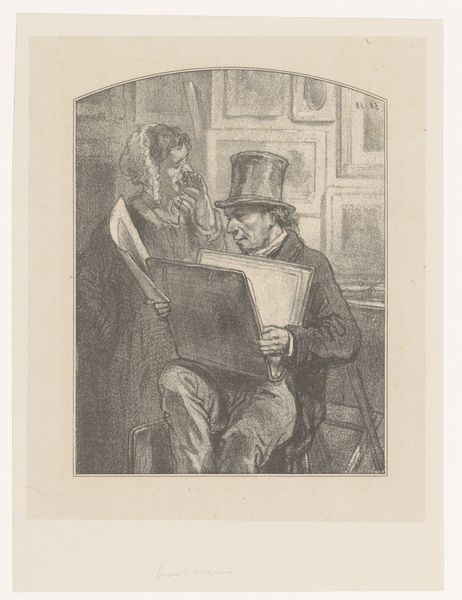 Curator: Here we have Henri de Toulouse-Lautrec's 1894 work, "Ida Heath at the Bar," a genre painting rendered with pencil in a print medium. Editor: Right away, the sheer delicacy is striking. It's so faint, almost as if these figures are fading from memory. There's something spectral about it. Curator: Absolutely, the sketch-like quality lends itself to that fleeting impression, so common in Impressionist works. Lautrec frequently depicted scenes from Parisian nightlife, offering a glimpse into a very specific world and time. Bars, cabarets… these were stages for social performances. Editor: That's it, a performance! I'm getting this overwhelming sense of melancholy though. Maybe because of that top-hatted figure’s slightly unsettling gaze? It’s all whispers and knowing looks in a smoky haze. And Ida herself… what's she thinking? Curator: It could be a comment on social interactions. Look at the placement of the figures – they're close, but not necessarily intimate. The symbols—the bar itself, the accessories like the gentleman’s cane—they signify social class, leisure, and a certain detached way of relating. Think about the historical context; this was the Belle Époque, a period of excess but also anxieties lurking beneath the surface. Editor: Excess and anxiety—such a good way to capture it. And this feeling of the hidden, maybe even forbidden. Even the woman, Ida Heath, looks like she is trying to remain invisible within the haziness. There’s a kind of sadness there, isn’t it? Curator: Indeed, and Lautrec masterfully evokes that mood through these subtle visual cues. It speaks to the complexities and often contradictory nature of human experience within a specific cultural milieu. This kind of image acts like a portal, offering insight into our understanding of that time period. Editor: You've given me so much to reflect on! All these hidden anxieties in the sketch are coming alive. I think I am starting to appreciate that there's more to this scene than just initially meets the eye. Thanks! Curator: It was my pleasure. I hope it illuminated some of the symbolism at play here!