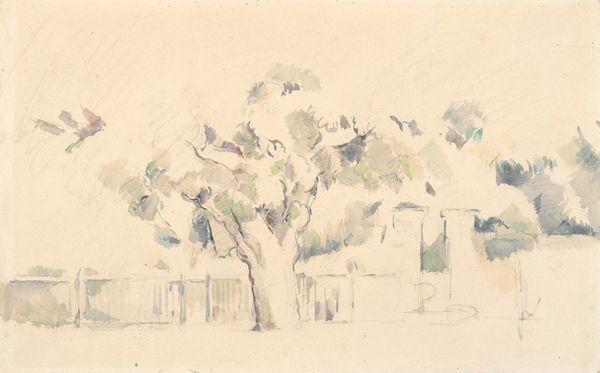 Editor: We're looking at "The banks of a river," or "Les Berges," a watercolor drawing by Paul Cézanne, made around 1888 to 1890. It feels quite…dreamlike, almost hazy. What do you see in this piece, from a historical perspective? Curator: Well, its dreamlike quality is partly rooted in the evolving role of landscape painting in the late 19th century. Cézanne, although shown at the first Impressionist exhibition in 1874, stands slightly apart from Impressionism. How would you describe the public's expectations around landscape art at this time? Editor: I suppose people were getting tired of academic landscapes, wanting something more real, less staged. Curator: Precisely! There was a growing desire to represent the world more authentically. Yet, consider the Salon system: while claiming objectivity, landscapes were inevitably intertwined with ideas about national identity and control of the gaze. The public consumption of art shaped both its production and reception. Editor: So, Cézanne’s haziness…it's a rejection of that clarity? Curator: Exactly. Instead of portraying a perfectly manicured scene as found in earlier Salon painting, he presents us with something fragmented. Do you notice how the river seems almost absent, blended with the shore? Cézanne's approach disrupts conventional power dynamics embedded in traditional landscapes, opening up more subjective engagement with the natural world. It challenges the audience to build their own interpretation rather than consuming the "truth." Editor: So, even in watercolor, he's making a statement. I hadn’t thought about the politics of landscape before! Curator: It's always there, subtly shaping how we see, interpret, and ultimately, value the world around us. This seemingly innocent watercolour actually encapsulates key debates around representation, authority and truth. Editor: I will never look at a landscape the same way again. Thank you.