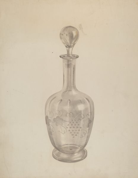 Curator: Here we have Elisabeth Fulda's "Candlestick," likely created around 1939, rendered in watercolor. It depicts a glass candlestick holder. What's your take on it? Editor: There's a delicate quality to it. The artist's use of watercolors creates a sort of hazy, dreamlike effect. I find it both simple and elegant. Curator: Considering the era, you know, just before World War II truly gripped Europe, functional designs like this gained a different meaning. Everyday objects became almost defiant expressions of normalcy. How do you think this watercolor contributes to that? Editor: The composition is certainly quite ordered; it's got a solid, centered verticality, the curves and lines meticulously crafted with some symmetry in the lower part and the stem but contrasting at the top, creating a bit of focal tension in that area. Curator: Right. Fulda worked during a time when functionalism, as seen in the Bauhaus movement, deeply influenced design. But it’s also interesting to see a handcrafted approach celebrating an item meant for daily life through the medium of fine art. A bit unusual but refreshing. It perhaps indicates how one makes sense of their reality using different forms of art. Editor: You can definitely sense that intention through the artist's attention to how the light interacts with the glass. See the transparency? The shades and colors blending smoothly create depth, imbuing a sense of both weight and ethereality. The choice of the light greenish blue color supports the mood it sets. Curator: Indeed, color plays a key role in setting the mood, given how its function and the social context surrounding candelabra—once objects central to interior illumination and social gatherings, slowly losing relevance with the rising presence of technology at home. This, coupled with the coming of war. How can we ignore its impact on the way we experience the ordinary? Editor: Good point. Maybe the very clarity in form reminds one to cherish simplicity, to seek warmth and solace through objects from a world threatened by chaos and uncertainty, an intimacy we find and take pleasure in. Curator: A quiet statement, perhaps? That an artifact intended to cast light, even in the dark times ahead, retains a place in the everyday imagination? I like that thought. Editor: Me too. This little candlestick is surprisingly resonant.