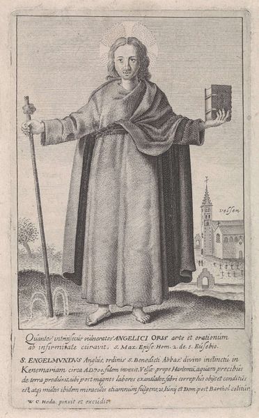 Curator: Let's delve into this print, "Portret van Savonarola," created in 1701 by Romeyn de Hooghe. The work, held here at the Rijksmuseum, utilizes the precise technique of engraving. Editor: The somberness immediately strikes me. It's austere, stark in its presentation of the figure, the textures are built through laborious lines, yet the tone speaks volumes about authority. Curator: Absolutely. De Hooghe was a master of conveying political messages through print. Savonarola, of course, was a complex figure, a Dominican friar who challenged the corruption of the Florentine Renaissance. De Hooghe places him amidst the city he preached against. Note the architectural forms, meticulously etched; the assembly of the crowds listening below. It's all carefully planned for maximum visual and symbolic impact. It speaks of power but also of popular sentiment. Editor: I'm drawn to how the lines construct Savonarola's garment. Look how heavy the robes appear, and at the hands; one raised in admonition, the other almost pleading, a sense of materiality brought out through the artist's skill in production and manipulation. Considering the historical context and potential use for didacticism, this attention to construction, to material, offers insights into 18th-century printmaking and what kind of market or need was supported. Curator: And indeed the clothing almost tells the whole story: from peasant simplicity to high cleric. He defied both. The way the engraver manipulates shadow becomes quite persuasive in constructing Savonarola's intense expression, a figure embodying resistance. Given the period's tumultuous religious and political landscapes, images like these held profound ideological sway, pushing against hegemonic discourses. It’s a very visual form of activism. Editor: We can almost feel the weight of those robes and consider where they were produced. This speaks not just of resistance or dogma, but also labor, to where and by whom those garments were constructed, what kind of value was placed on that kind of work. I suppose I see in these repetitive motions also the repetitive tasks behind his order. It's an object loaded with labor. Curator: His gesture towards the heavens while tethered to earthly fabrics...it shows the dual struggles. Examining the piece reminds me of the potency of print as a medium for circulating ideas. Editor: The print medium shows such dedication in its manufacture. It underscores, ultimately, the deeply considered and complex story behind this piece.