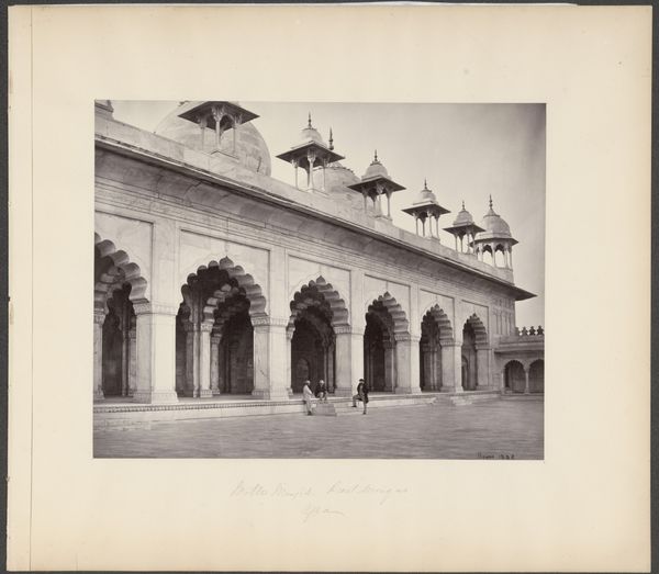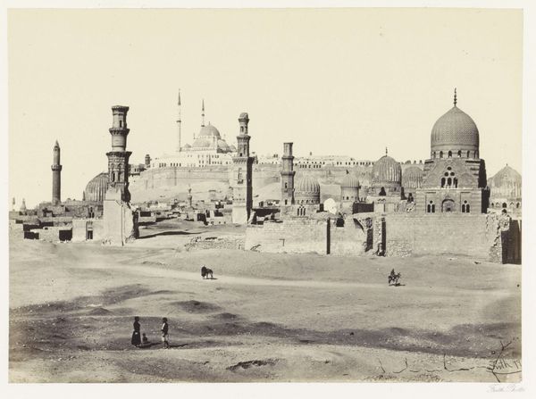 Editor: This photograph, "Gezicht op de Ibn Toeloenmoskee, Caïro" by Jean Pascal Sébah, dating from the late 1880s to mid-1890s, offers such a desolate view. I am curious about what a photograph like this communicates. How do you interpret this work? Curator: Immediately, I see a moment frozen in time, laden with cultural significance. The mosque itself is a powerful symbol, isn't it? Constructed in the 9th century, the Ibn Tulun Mosque carries echoes of ancient Islamic artistry and ingenuity. Yet, note the seemingly lonely figure standing within its courtyard and the signs of construction and possible damage to parts of the mosque, which give an emotional complexity to the image. It suggests resilience, doesn't it, or perhaps even challenges in maintaining these important places. Editor: Yes, it seems so austere! But why take a picture of what might be interpreted as a damaged or unfinished place? Curator: That's key. Think about how 19th-century photography often documented monumental sites, serving as records of both cultural heritage and, sometimes, colonial endeavors. Sébah's lens doesn’t just capture architecture; it captures the psychological weight of history itself. These old mosques have significant memories contained within their structures for local worshippers and artists. Editor: It's amazing to think how much symbolism a single image can convey. Curator: Precisely! Photography immortalizes a particular view or perspective of cultural places which have emotional value. The medium itself adds layers of meaning. Editor: I see. So the photograph operates on several levels – as art, documentation, and historical symbol. That's insightful! Curator: Glad to open that vista of interpretation. I find the blending of art and history always provides the most powerful connection to art.