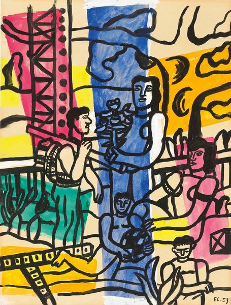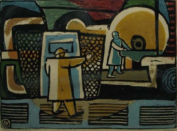 Curator: Examining Baumeister's "Two Epochs," from 1947, immediately directs us to the canvas itself—the base material for this mixed-media work. It also prompts us to consider artistic materiality in a world recovering from massive material deprivation due to wartime scarcity. Editor: Right, "Two Epochs"—created with mixed-media. It feels to me like a kind of symbolic landscape, perhaps a conversation between two figures. How do you interpret this work? Curator: What jumps out is Baumeister's engagement with process. Observe the texture – the visible brushstrokes, the layering. The painting's 'roughness' speaks of an immediacy of creation, seemingly defying any high art pretense and rather foregrounding the labor behind art-making. Where does that material ‘honesty’ lead you? Editor: That makes me think about the title itself, "Two Epochs," maybe Baumeister is contrasting two different ways of making art, the smooth and idealized versus the raw and expressive? Curator: Exactly! We need to acknowledge the social context. Post-war, artists were actively challenging traditional artistic boundaries. Consider the materials available: were they newly developed post-war, or re-purposed pre-war? Are we looking at scarcity consciously being displayed, or is there a celebration of what can be built after destruction? The answer, likely, is 'both.’ It represents the transition from one method of production and life into another. Editor: So the art becomes almost a record of materials and their manipulation, reflecting the era’s practical concerns and anxieties. That is an intriguing insight. Curator: The intentional act of creating using what one has is a very potent statement in a society focused on consumption and commodity. Editor: It’s really fascinating to view the painting through the lens of materials and social history. I’ll certainly consider that more in my own art appreciation.