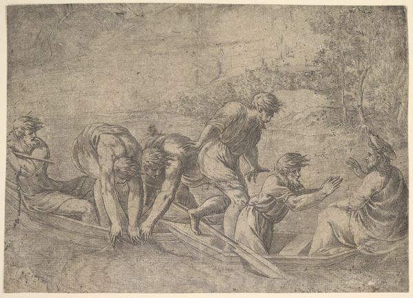 Niccolò Vicentino made this print, The Miraculous Draught of Fishes, around 1515-1550 using a woodblock. Woodcuts involve carving an image into the surface of a woodblock, and then applying ink to the remaining raised surface. Here, Vicentino printed the block in two different tones. This method simulates the appearance of a chiaroscuro drawing, which is an approach that uses strong contrasts between light and dark to model three-dimensional forms. Look closely, and you can see how the figures emerge from the surface. This effect is heightened by the texture of the paper. The image depicts a passage from the Gospel of Luke, where Christ instructs the fishermen to cast their nets, resulting in an abundant catch. What might otherwise be considered a divine occurrence becomes a study in labor; the fishermen strain and struggle, their muscles bulging as they haul in the miraculous draught. The print is a testament to the amount of work involved in emulating a drawing, reminding us that all images are made by human hands.