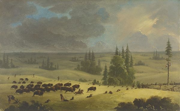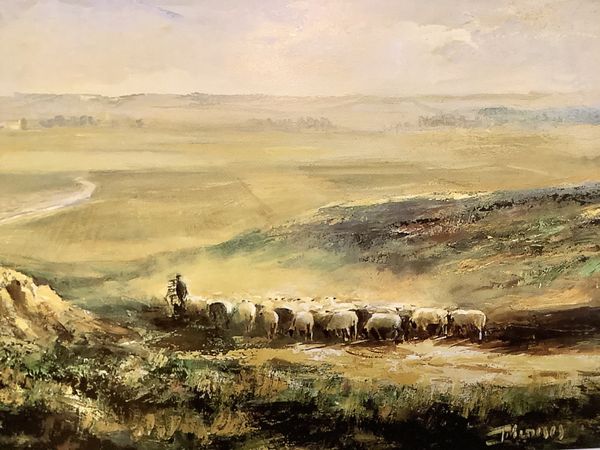 Editor: This oil painting, simply titled "Sheep" by Jesús Meneses del Barco, captures a scene of a shepherd and his flock in a vibrant, flower-filled field. There's something really grounding about the textured brushstrokes and the scene itself. What draws your eye when you look at this piece? Curator: I immediately consider the "plein-air" nature, highlighting the materiality of the oil paint itself. Think about the artist setting up their easel outdoors, battling the elements, working to capture fleeting light. The labor embedded in that process elevates our understanding, and we should acknowledge how it inherently impacts the work. Editor: That's an interesting point. It really does show the labor involved in creating it. Curator: Exactly! Also, examine the social context here. It's a depiction of rural labor, specifically shepherding. Consider the lifestyle, the economy tied to sheep, the value placed on pastoral scenes in art versus the actual realities of rural workers. How are they viewed in the broader context? Editor: That makes me consider the divide between the upper and lower classes, and their relationship with the land. I also hadn't considered the kind of lifestyle or profession this work reflects. Is it a romantic idealization or an honest depiction? Curator: Ask yourself that question when assessing any piece! Consider how art can also become a commodity in itself. "Sheep" may highlight an everyday labor that many could have taken for granted while glorifying a countryside existence that only a few got to experience. Also, note the blending of "high" art, in painting with materials and a social history typically left out. Where are the industrial laborers represented in the same way? What kind of power is embedded in displaying scenes like this as beautiful art? Editor: Thinking about this painting as a commentary on labor and social class is a fresh perspective for me. Thanks for expanding my view of this genre! Curator: Likewise. Analyzing art through a materialist lens invites us to question these conventional roles.