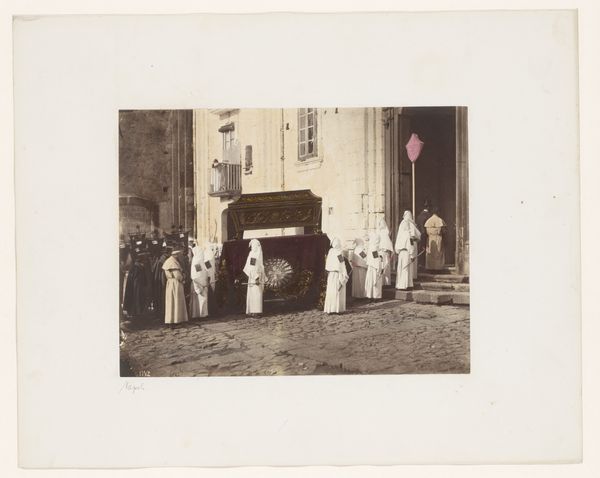 This photograph, taken in Naples by Giorgio Sommer, captures a funerary procession, a scene laden with symbols of death and the afterlife. Dominating the view, hooded figures evoke both solemn religious devotion and, perhaps unsettlingly, the specter of anonymity and hidden identity. Note the radiant sunburst emblazoned on the coffin's drapery. This ancient solar motif, typically symbolizing life, renewal, and divine illumination, takes on a poignant dimension in this context. We see this symbolism in the Egyptian sun god Ra, and later in Christian iconography to represent Christ. Here, the sunburst suggests a transition from earthly darkness to eternal light. The image resonates deeply with the human psyche, touching upon primal fears and hopes surrounding death. It is the cyclical journey of symbols through history and culture, constantly adapting and revealing new layers of meaning, that captures our collective memory and imagination.