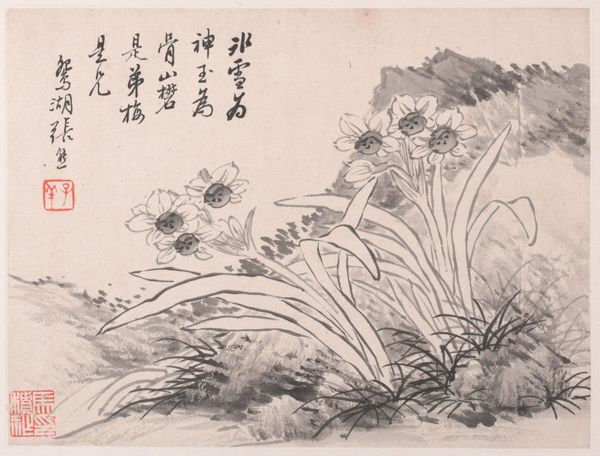 Curator: This lovely ink-on-paper artwork, titled "Orchids," dates back to the mid-19th century and is currently held here at the Minneapolis Institute of Art. Editor: The immediate impression is one of profound quietude, wouldn't you say? The washes of ink create an almost meditative visual rhythm. Curator: Absolutely. Considering the materials, ink was, of course, fundamental to scholarly expression. But here it appears the making and handling were as equally important as the botanical representation. It feels…unhurried. Editor: How might this particular type of imagery fit into the social history of artistic representation during that era? Does the orchid hold specific cultural weight? Curator: Precisely! Orchids, along with bamboo, chrysanthemum, and plum blossoms, held a distinguished place as "Four Gentlemen" in traditional East Asian art. Their cultivation and artistic depiction reflected an idealized scholar's studio and contemplative practice. These plants carried moral attributes; in this case, orchids often represented refinement, solitude, and integrity. Editor: So, these depictions become embedded within systems of status and value through the selection and preparation of particular natural forms and specialized tools... Curator: Yes, and also through calligraphy, like the column of text at the far right edge. Its careful placement is just as critical as any depicted orchid plant to both balance the overall image and underscore intellectual engagement. Editor: It almost reads as an argument for self-cultivation, an echo of social and intellectual refinement. It reminds us that an artwork of this period carries complex codes and aspirations beyond its immediate aesthetic. Curator: That's insightful, especially considering the museum space in which we find it today—part of a historical narrative actively being preserved and interpreted. Editor: Exactly. Viewing the piece here is only one moment in the longer chain of social processes related to the life of this image. Thank you, that offers a richer context! Curator: My pleasure. Examining both materials and the larger historical context hopefully grants the viewer an expanded appreciation.