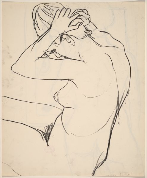 Richard Diebenkorn made this untitled drawing with ink on paper. Diebenkorn was a central figure in the Bay Area Figurative Movement, a time when artists turned away from abstract expressionism and returned to portraying the human figure. This drawing presents a nude woman, seen from the side, with her arms raised in a gesture that suggests surprise or startlement. During the mid-20th century, when Diebenkorn was working, the female nude was a conventional subject in art, often presented as passive objects. Here, the raised arms might hint at vulnerability, but also, perhaps, a moment of unexpected self-assertion. Diebenkorn's gestural, economic line captures the model's form without idealizing it, offering an intimate glimpse into a private moment. The drawing invites us to consider the tension between the artist’s observation and the model’s lived experience.