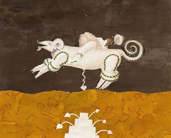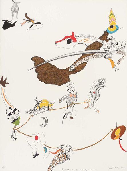 Curator: So, here we have Colin Lanceley's "Some Adventures of Don Quixote de la Mancha." It's... whimsical, wouldn't you say? The shapes seem both playful and a bit unsettling. Editor: It is! I see recognizable figures from the story, but rendered in such an abstract, almost dreamlike way. What do you make of the composition? Curator: It feels like a visual poem, doesn't it? Lanceley isn't just illustrating Cervantes; he's reimagining the spirit of Quixote. That mix of the absurd and the earnest... Have you ever felt that way? Like tilting at windmills? Editor: Totally! I guess it's about finding your own meaning, even if it looks crazy to others. Thanks for your insights! Curator: My pleasure! It’s pieces like these that remind us that art, like life, is an adventure in interpretation.