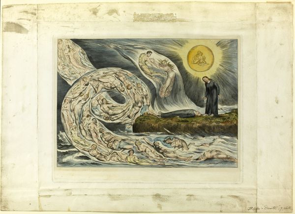 Curator: William Blake created this compelling image, "The Circle of the Lustful: Paolo and Francesca." Editor: The swirling forms immediately convey a sense of torment and relentless movement. Is this meant to be a depiction of hell? Curator: Exactly. Blake illustrates a scene from Dante's Inferno. Notice how the figures are caught within a vortex of wind, symbolizing their eternal punishment, driven by uncontrollable passions. Editor: The monochromatic palette heightens the drama, emphasizing the stark contrast between light and shadow to define the figures and the storm around them. The rendering is so emotionally raw. Curator: And Blake doesn't just depict punishment, he questions the romanticization of tragic love. The figures of Paolo and Francesca, embraced within the whirlwind, become a cautionary symbol. Editor: I appreciate the visual interpretation of such an old text – it offers a fresh lens through which we can understand human transgression. Curator: Indeed, Blake’s symbolism adds layers of meaning to Dante's narrative.