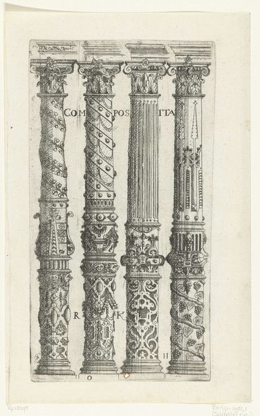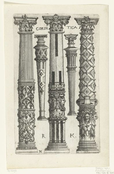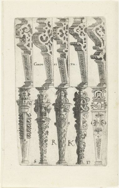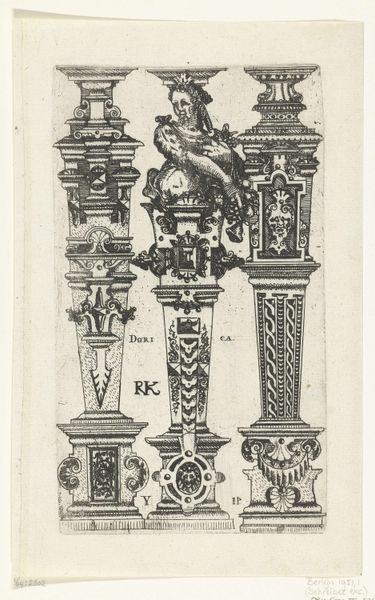 This print presents three Tuscan columns, their surfaces alive with fantastical ornament. An unknown hand etched these designs, rendering them in a monochromatic scheme that emphasizes form and detail. The columns are a study in contrasts, each structured by traditional architectural elements yet overflowing with inventive, and at times, jarring embellishments. Notice how the artist plays with the tension between classical structure and decorative freedom. The lines are precise, but the details teeter on the edge of the grotesque, especially evident in the column with floral and mask motifs, almost as if destabilizing the very notion of established aesthetic norms. Consider these not just as representations of architectural elements, but as semiotic structures. They invite us to decode the visual language of form and decoration within a specific cultural context, challenging our assumptions about beauty and order. The dialogue between form and decoration invites us to reinterpret the value we place on tradition versus the innovation of form.