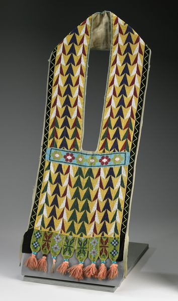 Curator: Here we have a captivating object simply titled "Hat." Unfortunately, the artist and precise date are unknown, but it resides in the Minneapolis Institute of Art and appears to be rooted in African textile traditions. Editor: My first impression is how festive and celebratory this feels. It’s so meticulously crafted—and surprisingly vibrant. There's a playful geometry at work with all the colorful beadwork. Curator: Exactly. Considering it as textile folk art gives us a window into communal artistry, where patterns and colors could be interwoven with societal stories or individual expression through decorative art practices. We must acknowledge this item’s production as work that embodies particular aesthetic and economic values, challenging that high-art/craft distinction, especially regarding accessibility of resources and cultural meanings it conveys. Editor: I can almost hear the rhythmic click of beads during the making process; it feels incredibly labor-intensive! What are your thoughts about the repetitive nature of decorative beadwork? Is it a kind of meditation for the artisan or does that romanticize it? Curator: I believe the rhythmic repetition you observed connects closely to meditative and time-consuming labour of women, who frequently turn daily acts into innovative art practices. Looking closely, notice its form. Its geometry in these shapes and how it might function as symbolic language in African art is compelling, indicating some hierarchical meaning; this is all culturally and socially encoded, of course. We could ponder who might wear it and in what contexts, from ceremonial uses to more informal displays of social stature. Editor: True. Thinking of headwear and adornment…it's transformative! When I look at it, the vibrant colors pop but the small embellishments evoke the cosmos! Even more impressive when remembering its pure functionality. Curator: Thinking about its role materially lets you enter that culturally situated creative domain, which, I imagine, leads back around to those cosmological narratives. What kind of impact do you imagine we are having as interpreters ourselves here at this intersection in time? Editor: Perhaps the beauty is less about definitive statements than an ongoing engagement. For me it becomes something entirely new within my consciousness! Curator: Very eloquently said, actually! We hope our reflections offer insights that help listeners come closer toward this captivating object as part of greater human activity around it through making itself.