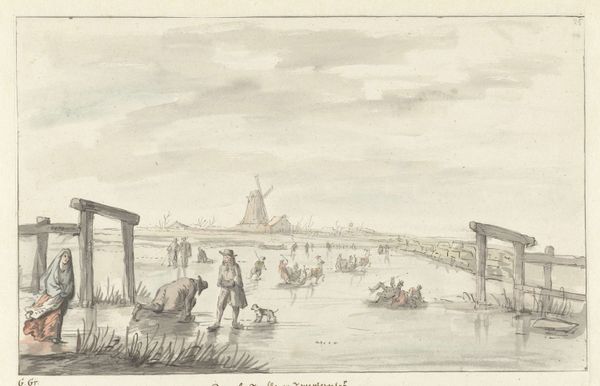 Curator: What a charming depiction of a winter scene. Gerrit Grasdorp, likely between 1661 and 1693, created this watercolour, "Wintergezicht op het Zwarte Water bij Zwolle(?)," which translates to Winter View of the Black Water at Zwolle. The scene gives such a feel for Dutch life at the time. Editor: It certainly does evoke a particular mood—I’d call it understated and somewhat precarious. The icy expanse seems vast and the figures are small, dwarfed by the pale sky. I keep looking at those figures attempting to navigate the ice and their gestures as clues about their experience. It is making me reflect on fragility, literally in the people moving on the ice but also more broadly on existence itself. Curator: That is a fair assessment, especially considering the Little Ice Age period during which it was made, which affected the lives of those in Northern Europe considerably. I see the frozen river as representing how natural elements impacted daily life and social activities of the 17th century Dutch population. The artist seems less interested in individual portraiture and more in conveying communal activity on this shared, frozen landscape. Genre painting indeed, as they navigated their lives and social relationships in ways very much dependent on and dictated by their environmental factors. Editor: Precisely! Water, of course, is one of the fundamental and multifaceted symbols –- purity, cleansing, life and, paradoxically, also chaos and the unknown. Grasdorp plays on this contrast, trapping people on the river, their freedom suspended, on this vast sheet of ice. Notice how that horizon with the Zwolle cityscape almost serves as an aspirational idea of life away from the dangers. The windmill almost takes on a religious symbolism of hope and maybe an encouragement to persevere to get to dry land on the other side! The ice almost represents a purgatorial moment of uncertainty about what the near future holds. Curator: Very insightful, I agree that Grasdorp captures both the charm and precarity. And that city line that perhaps also gives people the encouragement to pursue life in a well managed urban area where nature might have slightly less dictatorial power. This watercolour is part of the Dutch Golden Age and that aesthetic also reminds us to perhaps not read the moment as hopeless because there were immense technological, artistic, and societal achievements to be celebrated at that moment in time, despite their struggles against nature! Editor: Thank you! Overall, I think the subdued palette reinforces that idea of a certain humility towards nature while that windmill encourages people to keep going, a subtle yet beautiful piece of social commentary with layers to unravel.