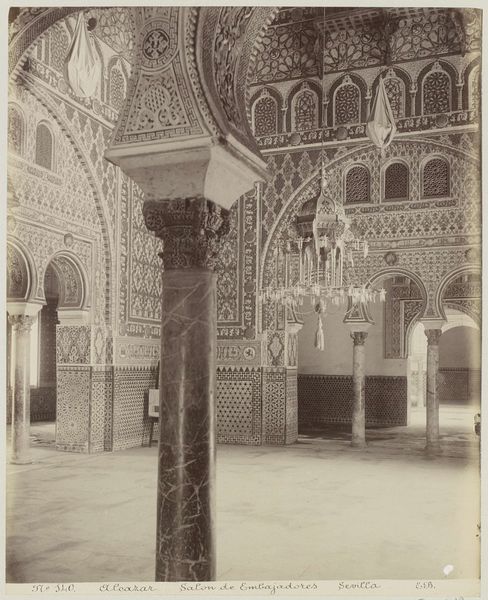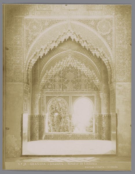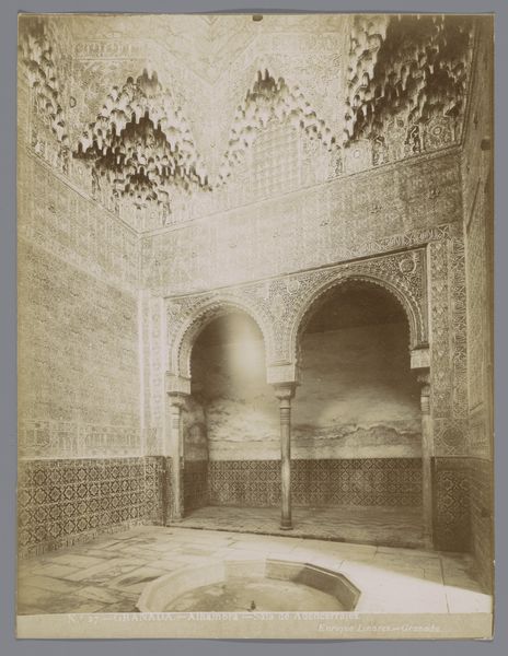 Curator: This watercolor by F. Linares, dating from between 1860 and 1900, captures the Salón de Embajadores, the Hall of the Ambassadors, within the Alhambra palace. Editor: The effect is rather stunning. The symmetry, the repetitions of arched openings, the overall tonality – it exudes a tranquil grandeur. It feels almost… timeless. Curator: The Alhambra, a palace-city built primarily in the 13th and 14th centuries, represented the pinnacle of Moorish rule in Spain. It’s important to consider the European fascination with “Orientalist” themes during the Victorian era. Works such as these fueled imaginations and often romanticized cultures in ways that both reflected and reinforced imperial power structures. Editor: Indeed. And yet, considered purely formally, note how Linares employs watercolor to capture light itself. The graduated tones give depth to the architecture, that complex geometry. Notice how, despite being seemingly monochromatic, the tonal shifts provide the forms with substance? Curator: Yes, the play of light is undeniably captivating. One cannot ignore the political reality of the setting and period. The Alhambra became a site for re-enacting and imagining power relations through art and travel. Linares' artwork contributed to shaping the perception of this historical monument and its associated cultures in a particular social and political context. Editor: Agreed, the historical context is vital, but I maintain that this image’s immediate allure arises from Linares’ sophisticated manipulation of visual elements, and, let's not overlook the watercolor’s subtle nuances on aged paper. That contributes profoundly to its impact. It prompts reflection on permanence versus the ravages of time. Curator: It’s a compelling reminder of the layers embedded within art, a nexus where technique meets socio-political meaning. Editor: Precisely! And seeing this, you start to really appreciate the skill required to make something feel as substantial and otherworldly.