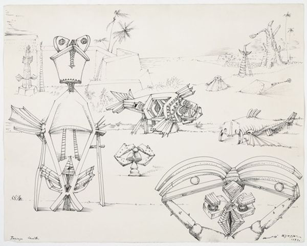 This madcap drawing was hatched on paper by Saul Steinberg, no date given. I love the way Steinberg uses humble materials like colored pencil to elevate simple lines into sophisticated statements. It’s artmaking as thinking, a process laid bare. Look at the hill, the artist-dog teetering on top, painting, with all these strange characters strewn below. The color is thin, the surface raw, a kind of deadpan absurdism. The lines are so direct, almost childlike, but the composition is complex, a real juggling act. There’s the cat with the crazy eyes, the dismembered human, the flying fish with teeth! It’s a parade of the peculiar. Steinberg reminds me a bit of Paul Klee, who also embraced playful experimentation. Both artists show us that art doesn't always need to shout; sometimes, the quietest voices carry the most weight. It’s a reminder that art can be a conversation, an open field of possibilities, rather than a closed book.