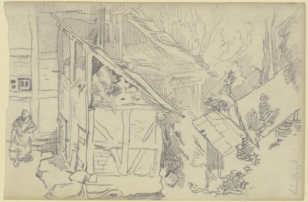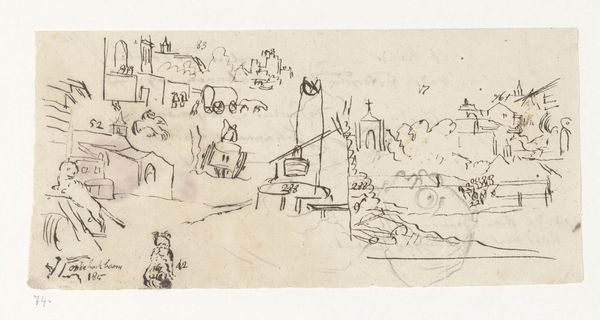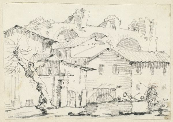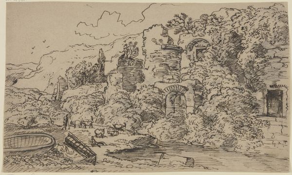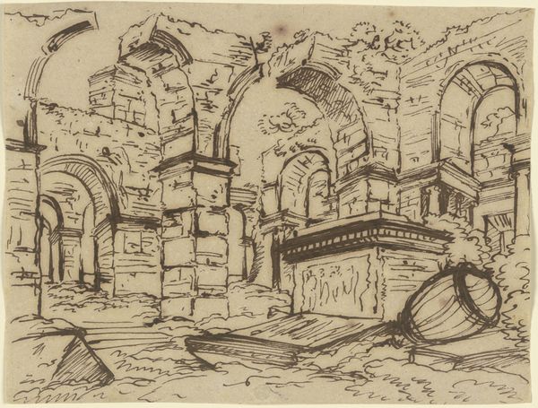 Franz Kobell rendered this landscape of antique buildings and a statue with pen and brown ink. The immediacy of the drawing emphasizes the artist’s skill, using the ink to create a sense of depth and texture, and the absence of color focuses the attention on the way it was made. The linear quality of the medium allows for precision and control in the depiction of architectural elements, while the fluidity of the ink captures the spontaneity and fleeting nature of the landscape. The stark contrast between light and shadow creates a dynamic play of forms, further enhancing the three-dimensionality of the scene. The choice of pen and ink as a medium speaks to a tradition of draftsmanship rooted in observation and technical mastery. It’s a reminder that even the simplest of materials can be used to create profound and evocative works of art. By understanding the materials, the making, and the context, we can appreciate the full meaning of this sketch.