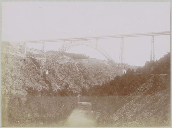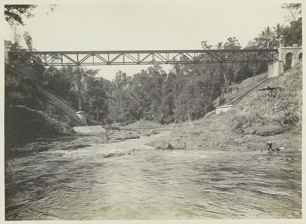 Editor: We're looking at an anonymous gelatin-silver print from between 1931 and 1940, titled 'Spoorbrug Tjisomang,' held here at the Rijksmuseum. The towering bridge cutting across a verdant landscape almost feels like an invasion. What visual dynamics strike you most forcefully about this piece? Curator: The stark geometry of the bridge, rendered in such high contrast against the organic, almost chaotic backdrop of the jungle, is compelling. Note the sharp diagonals created by the bridge's supports and how they intersect with the softer lines of the foliage. This tension between the man-made and the natural is crucial to the photograph's meaning. Editor: The train appears small, almost incidental, relative to the vastness of the structure. Is this contrast intentional, perhaps speaking to human ambition? Curator: Indeed. Consider the meticulous arrangement of light and shadow across the entire composition. The photographer has used light to accentuate the bridge’s structure, transforming it into an almost abstract pattern. The train itself becomes a minor detail within this larger framework, emphasizing the power of form over narrative. Editor: So you see the artist prioritizing pure visual form and relationship, not just the story being depicted? Curator: Precisely. The photographic medium has been harnessed to distill the scene to its core formal elements: line, shape, and tone. This transcends simple documentation, elevating it to a powerful visual statement. What initially read as documentary now appears charged with formal significance. Editor: I appreciate how focusing on form has revealed an entirely new perspective on the photograph for me. Curator: Indeed, considering the inherent qualities encourages greater scrutiny and understanding, revealing further richness to this photograph.