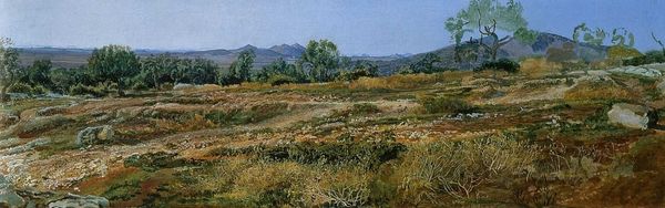 Editor: Here we have "A View of the Village" by Willard Metcalf. It’s an oil painting and gives off such a serene and nostalgic feeling. I’m curious, looking at the visual symbols and imagery, what do you see in this piece? Curator: This seemingly simple landscape brims with cultural echoes. Note the lone figure, a child, nearly swallowed by the golden field. This instantly triggers notions of innocence and the individual's relationship with nature. Consider the village in the distance, the church steeple a prominent feature – it represents community and shared belief. What kind of memory, or idea, might Metcalf be suggesting through such symbolism? Editor: It’s almost like a dream, or a memory of childhood summers. The kid seems really small and maybe vulnerable? Curator: Precisely. Now, observe how the brushstrokes are applied – broken, and loose. These marks are the visual vocabulary of Impressionism, reflecting a fleeting moment, capturing light and atmosphere. And that church steeple... a visual tether to the past, a connection to something lasting amid the ephemeral nature of the scene. How might this painting speak to the rapidly changing American landscape at the time? Editor: Perhaps a longing for simpler times, a connection to nature and community amidst industrialization. It’s like a visual poem. Curator: Yes, that's insightful! This landscape is more than just scenery; it's a carrier of cultural memory, a conversation about identity, community, and our place within a larger historical narrative. Each brushstroke holds meaning, whispering stories of a time gone by. Editor: I see it now, all the layered meanings behind this village scene! I hadn't considered the symbols that are tied to time, community, and history. Thank you! Curator: My pleasure. Hopefully, it provided a different lens to see with.