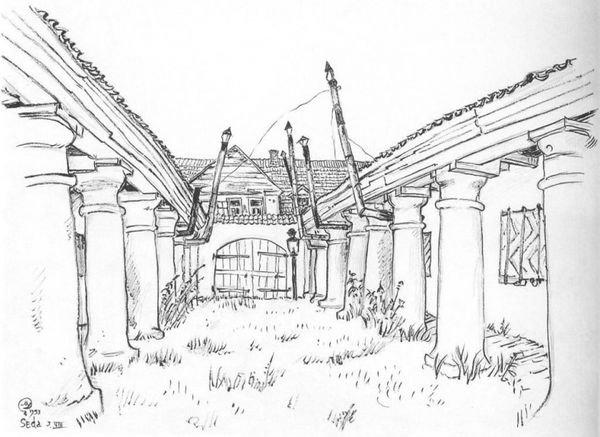 Curator: Mstislav Dobuzhinsky's work, "Seda, old warehouse," uses watercolor, ink, and pencil to capture a slice of urban life. What's your immediate reaction? Editor: It’s got a sort of wistful, melancholic air about it, don't you think? The palette is muted, and the sketch-like quality adds to a sense of transience. Curator: That melancholy, as you say, resonates with the transformations gripping societies across Europe. Dobuzhinsky often captured this changing landscape and the feeling of places fading away. Editor: The textures here are fascinating. Notice the contrast between the smoothly washed watercolor and the scribbled details of the brickwork and trees. There’s real attention to the materiality of the place, the grit of the stone, the way the light hits different surfaces. It's about construction but the sense of deterioration too. Curator: Absolutely. Dobuzhinsky skillfully blends realism with a touch of romanticism, turning a seemingly ordinary warehouse into a subject worthy of contemplation, in line with his artistic circle's aim of mirroring socio-political anxiety about modernization and progress. Editor: It prompts consideration of labor too. Warehouses exist as spaces of production and distribution. Showing an "old warehouse," could represent labor’s decay or shift. Curator: Very astute. Furthermore, one might reflect on the place of art within society; is this painting an act of memorializing? A critical engagement with shifting industry and culture? Editor: I'm especially struck by how the light almost seems to emanate from within the building itself. It is like the warehouse possesses memories and an unspoken history, brought alive through the artist’s craft. Curator: It does invite reflection. I see Dobuzhinsky inviting us to confront the relationship between progress and decay in the modern urban experience. Editor: And for me, it’s the layers of technique, pencil, ink and wash working together, evoking not just a place, but a feeling of place as shaped by labor, materials, and time. Curator: It offers much to consider indeed. Editor: It does.