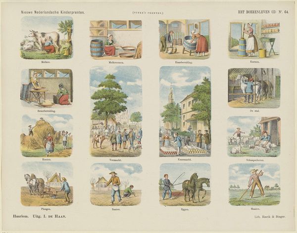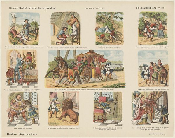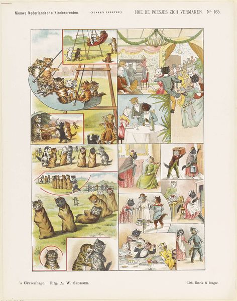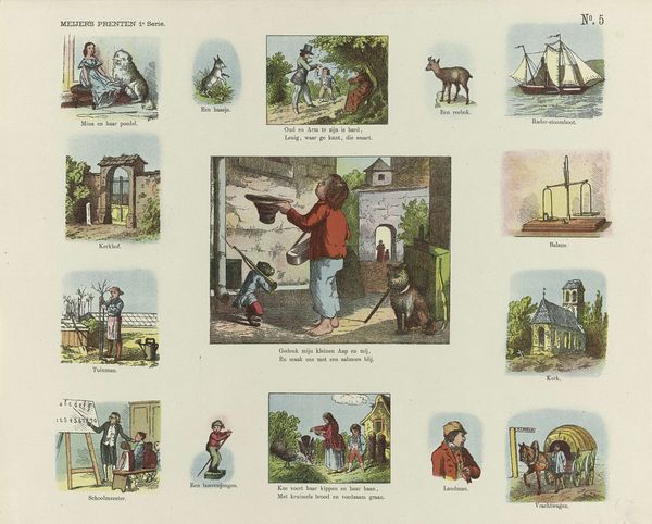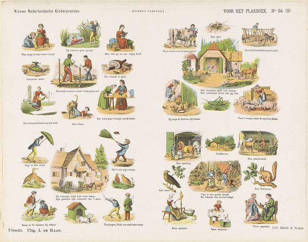 Curator: "Voor het Plakboek," or "For the Scrapbook," created by Jan de Haan sometime between 1875 and 1903, gives us a grid of colourful vignettes, a real treasure trove of late 19th-century scenes, printed on paper. My first thought is: nostalgia in neat little boxes! Editor: Yes! I feel like I’ve stumbled into someone’s cherished childhood memories. It's incredibly charming. It reminds me of those old-fashioned sampler stitchings but with delightful narratives instead of floral motifs. Curator: Absolutely! There's such a storybook quality to it all. I love the way each individual image functions like a little emblem of a simple pleasure or moral lesson. Take for instance the image of the two boys snowball fighting with what looks like a giant polar bear looming in the background, a potential symbol of the dangers of winter, and even recklessness! Editor: Good eye. Or consider how images of the camel are contrasted: in one instance a single dromedary, in another two boys menacing a white Bactrian. This play in presentation is, if nothing else, endlessly engaging. Notice too the many symbols of human dominion: the eagle shot from the sky, the horse and stag in human possession. This seems quite emblematic of its period. Curator: I think you nailed it! Given the title's implication of a 'scrapbook,' it could have been part of a larger pedagogical collection for children's education, perhaps? Editor: A fascinating idea. Beyond the specific scenes, it's worth noting that a print like this offers us a window into a particular era's ideals, its pastimes, and its perception of childhood itself. It's like a condensed cultural capsule. It has some real Japanese Ukiyo-e vibes as well! Curator: Now that you mention it, there is that clean, flat aesthetic to each illustration, so distinct! The past continues to resonate in images like these. Editor: Indeed, and thanks to prints like "Voor het Plakboek," the echo becomes that much louder!