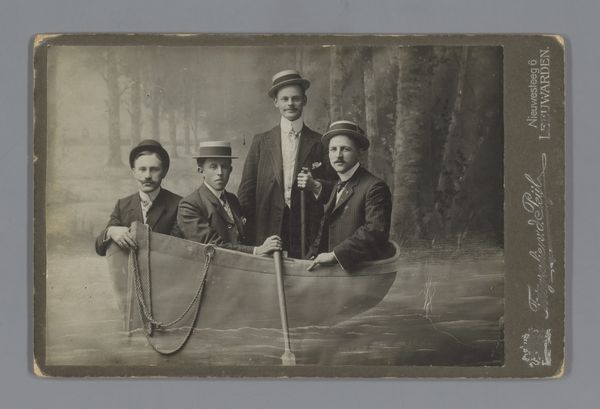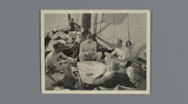Curator: What a captivating piece of vernacular photography! Here at the Rijksmuseum, we have "Five Sailors on a Sailing Ship," a gelatin-silver print likely captured sometime between 1940 and 1943. Editor: It makes me feel a little wistful, you know? A grainy snapshot of ordinary joy, juxtaposed with the uncertain backdrop of those war years. There's a strange timelessness about it too, those boys could be anyone, anywhere… Curator: Indeed. Considering the limitations and widespread availability of the technology and materials for developing gelatin-silver prints at the time, it certainly speaks volumes about photographic practices as a form of documentation available across societal strata. Editor: I imagine it might’ve been stuck on someone’s fridge door for years, capturing the memory of seafaring days. There is an inherent value that photography, often seen as documentary rather than expressive, allows these working class sailors and their experiences to be visible. The framing almost pushes us to question who has access to creating representation of these experiences and memories. Curator: Precisely, this challenges assumptions regarding “art” as the province of the educated, the moneyed. The accessibility of the medium and the mundane nature of this subject matter point towards a deliberate turn toward more widespread creative practices. Consider that at this moment, mass communication and the dissemination of photographs becomes more streamlined. Editor: And to think that this print, mass-produced at the time, now has a distinct weight because it’s an archive. The five of them huddle together almost awkwardly, like they don't know how to pose for the camera, their youthfulness is just amplified by the old photo and all of it, their outfits, the background seems foreign today. They didn’t set out to create art, but look at it! Curator: Which perhaps points to the social reality that such labor, on a sailing vessel, likely remained outside mainstream considerations about cultural work worthy of capturing and showcasing. Editor: Right. Makes you think about all the invisible hands. It brings history to life in a startlingly personal way. It's the real world captured on film. Curator: It prompts one to consider how technological advancement shaped working-class pastimes and practices, giving rise to more artistic pursuits from unforeseen sources. Editor: Definitely food for thought, or should I say, photos for thought!