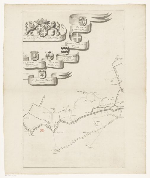 Editor: This is “Kaart van de rivier de Eem (eerste deel),” or "Map of the River Eem (first part)," created by Thomas Doesburgh in 1692. It's an ink and engraving drawing on paper, housed at the Rijksmuseum. Looking at this, the precise lines and organized composition really strike me. It feels very technical and meticulously rendered. What aspects of this piece grab your attention? Curator: Immediately, it is the dialectic between precision and abstraction. The map's function is explicitly representational, but observe how Doesburgh employs line weight and density. See how he uses the variations in linework to denote topographical features versus political demarcations. What semiotic system can we decipher from this interplay? Editor: It’s almost like he's creating a visual language with the line itself! The varying thicknesses help distinguish, say, a settlement from a geographical boundary, wouldn't you agree? Curator: Precisely! Consider, also, the visual weight. The ribbons displaying family crests aren't functionally related to the river's course. Yet, they occupy considerable space, diverting the viewer’s eye. Does this not shift the piece away from pure functionality, inviting subjective, even aesthetic contemplation? Is the artist commenting on the influence and prestige of these families on the River Eem and its traffic? Editor: That's a perspective I hadn't considered! It reveals a power dynamic literally mapped into the landscape. So, the artwork functions beyond just being informative; it also visually represents a hierarchy. Curator: Yes. Ultimately, the essence of the map is in its articulation, and Doesburgh’s orchestration of graphic elements to give the visual effect more volume and depth. This allows us to gain insight and form opinions regarding the map as a diagrammatic code for social structures. Editor: This deepens my understanding, it’s not just about location, but layers of meaning communicated through visual language. Curator: Indeed; an appreciation of pure line becomes an appreciation for more complex realities.