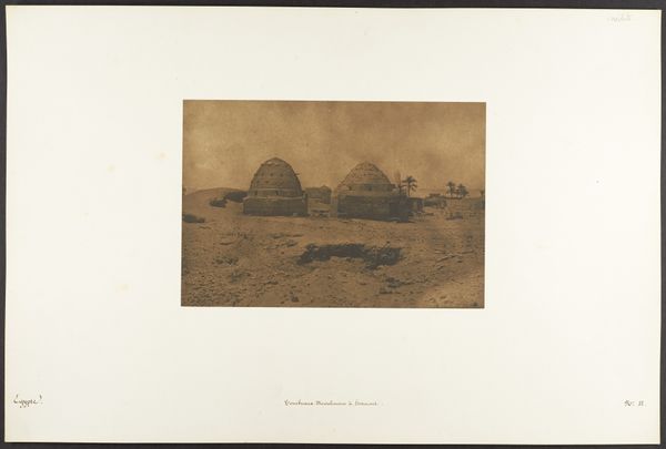 Editor: Looking at Maxime Du Camp's "Vue du Temple d'Amada - Coupole ruinée d'une Eglise Copte," a daguerreotype from 1850, I'm immediately struck by the desolation of the scene. The architectural ruins appear isolated. What exactly does this image say about 19th-century Egypt, from your perspective? Curator: It reveals much about the European gaze on Egypt at the time. Photography like this, especially daguerreotypes, served as documentation but also reinforced a narrative of a land to be explored and understood through a Western lens. How do you see the inclusion of human figures in the composition affecting the overall meaning? Editor: I noticed them too, they seem like intruders, not a part of the place. Maybe they symbolize the West's intrusion into Egypt? Curator: Precisely! Their presence hints at colonialism, scientific expeditions, and a certain romanticization of decay. But also, it gives scale to the building. How do you think the ruined state of the Coptic church ties into a broader historical context? Editor: Given the rise of archaeological interest in Egypt during this era, it's easy to see that. Is the focus of the image more the archeology of an important historical site or about the place in and of itself? Curator: An insightful question! It's both, but with a slant. It showcases a monument representative of a blend of ancient Egyptian and early Christian cultures, ripe for 'discovery' and interpretation, furthering specific colonial agendas. It represents control over narratives of power, really. Editor: I've definitely never looked at landscape photography this way. I was caught up in what's *in* the image, not the power that producing the image represents. Thanks! Curator: Indeed. Context is everything, influencing how we see and interpret such pieces and understand their complex historical impact.