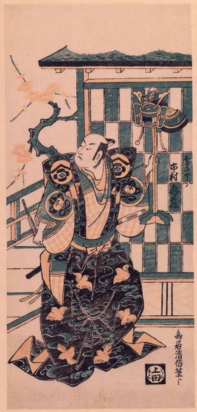 Editor: This compelling woodblock print by Katsushika Hokusai features two figures: Onikojima Yatarō and Saihōin Akabōzu, locked in a tense struggle. I'm immediately struck by the dynamic composition and how the artist uses line and color to create a sense of power. What can you tell us about the historical context and interpretation of this image? Curator: It's interesting that you use the word "power" – what is particularly striking is how Hokusai is representing *authority*. This print needs to be read through the lens of the socio-political structures of 19th century Japan and how those structures shape representation. Ask yourself, how does the artist utilize his visual language to show their individual power relationship? For instance, what can be learned from how Akabōzu is positioned under Yatarō? What do you read from that positioning in this image? Editor: Well, he definitely seems pinned, almost overwhelmed by Yatarō and the large, geometric shape bound in rope above them both. Is that object of cultural significance? Curator: Precisely! Think about how ukiyo-e prints like this one, although popularized as "everyday" scenes for the rising merchant class, also served to solidify social narratives, political messages and values of the era. The use of figures from popular stories enabled artists to reinforce the roles that these legendary figures embody in Japanese society. Hokusai invites us to analyze not only the figures' power but how authority is visually represented and who benefits from it. Editor: That’s fascinating, the interplay between art and societal structures makes me reconsider how I’ve always looked at this print! Curator: Exactly. By exploring the political landscape in which Hokusai produced this work, it gives us new insight and expands our understanding of Japanese social identity and cultural power structures.