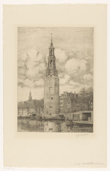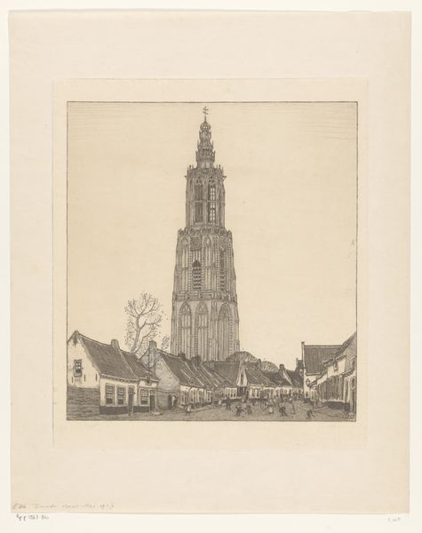 Curator: The work before us is an etching by Constant Nefkens, titled "Straatgezicht met kerktoren," or "Street View with Church Tower," dating from before 1938. Editor: There's a striking stillness to it, almost melancholic. The sharp, vertical lines of the church tower dominate the composition. It's so detailed it’s photorealistic, and contrasts sharply with the more diffuse, grainy treatment of the foreground street. Curator: That verticality is significant, wouldn't you agree? Church towers have, throughout history, functioned as powerful cultural symbols – visually communicating stability and moral authority across time and space. Editor: Absolutely. I’m particularly drawn to the social aspect here. Consider how urban development and societal values intertwine in renderings of sacred places like this. This particular tower probably played a pivotal role in shaping community life. You get a sense of a tight knit world in this pre-war urban setting. Curator: Etchings like this provided broader audiences access to that social power. Printed images of religious landmarks allowed the values associated with them to permeate society and function like emotional anchors, establishing visual traditions. This piece strikes me as representative of that. Editor: Indeed. But I think Nefkens might also be offering some subtle critique. Note how the surrounding buildings seem to almost huddle in its shadow, as though dwarfed by the power it represents. Perhaps it hints at the shifting socio-political power of the church as other modernising influences start to reshape society in that period. Curator: That interplay between shadow and prominence certainly adds complexity. This tension makes one reconsider the presumed social value it represents. Editor: It really highlights the role artists play in actively documenting and interpreting social structures. Pieces like this aren't just about architecture, they are cultural snapshots frozen in time that let us interrogate power. Curator: I agree. Studying works such as "Street View with Church Tower” really provides some insights on the symbolic influence these structures carried. Editor: A pertinent piece when one considers that built spaces serve as more than mere architecture and the public role that works like this take on in shaping our perception.