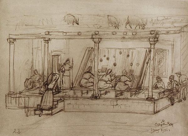 Curator: This is Adolf Oberlaender’s “The Piano’s Revenge,” a small drawing held here at the Harvard Art Museums. Editor: What a peculiar image! The stark contrast immediately suggests tension, doesn't it? Curator: Indeed. Oberlaender, though details are scant, likely aimed to critique bourgeois domesticity through his satirical illustrations. Notice the piano dominating the scene. Editor: The piano’s form is quite aggressive. It juts out, almost devouring the figure crawling beneath it. It's as though the instrument has become a predator. Curator: Perhaps, highlighting the drudgery of maintaining such status symbols. The labor involved is far from glamorous. Editor: A powerful observation. The starkness isolates the figures, forcing us to confront the implications of their interactions. Curator: Precisely. It offers a glimpse into the artist's critique of societal expectations. Editor: I find its simplicity quite compelling. It invites us to consider the relationships we have with objects in our lives.