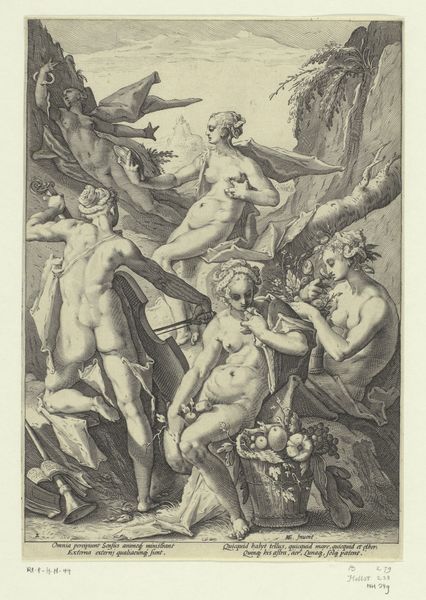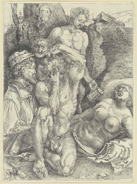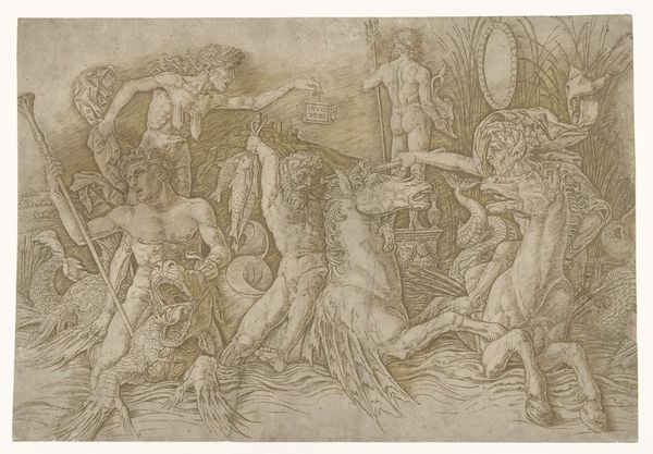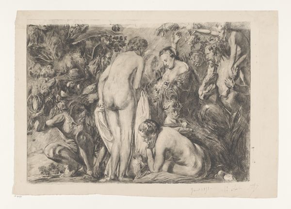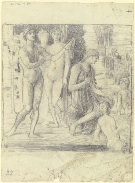 Curator: Paul Cézanne's drawing, "Cinq baigneuses," which translates to "Five Bathers," from around 1879 to 1882, is before us. Executed in pencil, this work presents a fascinating glimpse into the artist's process. Editor: Oh, interesting. Right away, I'm struck by how unfinished it feels. Not in a bad way, mind you! There's something intimate about seeing the scaffolding, those grid lines faintly visible beneath the figures. Like we’ve caught Cézanne mid-thought. Curator: Precisely! The grid suggests a methodical approach, perhaps a system for mapping out the composition. Bathers are a recurring motif for Cézanne, and here, we see the nascent stages of an idea he would explore throughout his career. Consider, for example, how the arrangement evokes classical depictions of nymphs, a visual link stretching back centuries. Editor: Nymphs at a pool party, maybe. They definitely have this sense of being caught in a candid moment. The bodies are so…unidealized, and very deliberately unidealized. What are your feelings about the choice of leaving it as just pencil? Does it change how the nudes are viewed when it's not colored and pristine? Curator: I think the medium underscores the pursuit of form over mere representation. The use of pencil allows us to see how the artist sought out geometrical forms to create more organic structures and compositions. Think about the symbolism of water, often associated with cleansing and rebirth, which could imply deeper spiritual associations linked to femininity and community here. Editor: That makes sense. Though to be honest, the first thing I thought about was how much sunblock they’re missing. There's also, strangely, something so grounded in this scene. These feel less like classical ideals and more like, women taking a break from their lives. Curator: That tension between the classical and the modern is characteristic of Cézanne's work, his capacity to invest age-old themes with contemporary life. Editor: Absolutely, he manages to humanize the age-old story, doesn't he? Well, this little glimpse behind the curtain was captivating. I have more to ponder than before. Curator: As do I. "Cinq baigneuses," even in its seeming incompleteness, proves that artistic brilliance often lies within the journey, not just the destination.