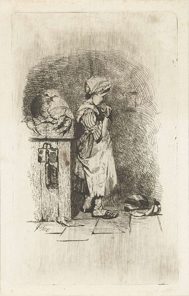 Editor: This is "Prøveplade: En spindende kone," or "Study Sheet: A Spinning Woman" by Frans Schwartz, from 1899. It looks like an ink drawing or maybe an engraving. The woman looks really focused. What historical context should we consider to understand this? Curator: Given that it’s from 1899, we should consider the rise of Realism in art and its connection to representing everyday life and labor. How do you think this image participates in, or maybe resists, those movements? Is this a glorification or something else? Editor: It doesn't seem romanticized; it feels quite ordinary. Is it possibly a comment on the social roles of women at that time, maybe their confinement to domestic tasks? Curator: Precisely. Consider the intended audience for prints like this. Were they primarily for wealthy patrons or a wider public? Who was consuming these images and how did that shape their meaning? Think about how prints circulated imagery and ideas. Editor: So, were these images used to reinforce the status quo or challenge it, or maybe both depending on the audience and how it was received? Curator: Exactly. Also consider how institutions like the museum itself affect how we interpret the piece. Its very presence here changes how we might understand it. Does being exhibited change how the art gains significance? Editor: Wow, I never considered the museum itself influencing meaning so actively. That really makes you think about who controls the narrative of art history. Curator: Right. Seeing art in this light highlights how power structures shape our perceptions of the past. This print might not seem overtly political, but considering the social forces around its creation and reception really enriches our understanding. Editor: I see. Thank you. This has shifted my perspective, viewing art as a product of historical and social factors.