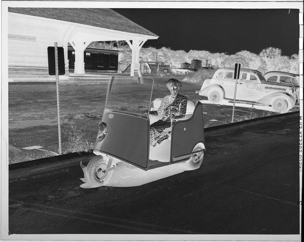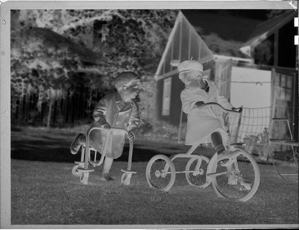 Curator: Martin Schweig's untitled photograph captures a young boy pushing a baby girl in a stroller. It's a silver gelatin print, quite small, roughly 4x5 inches. The Harvard Art Museums hold this particular print. Editor: It's evocative. The reversed tones give it this eerie, dreamlike quality, like a repressed memory bubbling to the surface. Curator: Precisely. The tonal inversion alters our perception. Observe how the composition directs our gaze—the vintage car, a powerful horizontal mass, competes with the children for dominance. Editor: I wonder what the story is here. Is he happy? Is she enjoying the ride? Or is this about the burden of childhood responsibilities, prematurely thrust upon him? The image asks more questions than it answers. Curator: Indeed. The photograph's ambiguity lies in its structural elements—the contrasting scales, the tension between stasis and movement—inviting multiple interpretations. Editor: It's a small image with a big presence. I leave with a disquieting sense of nostalgia, questioning what is innocent play and what is not.