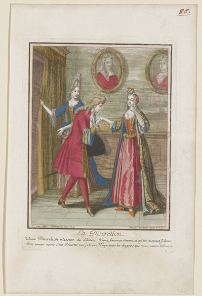 This is 'L'Eau,' made by Nicholas Arnoult around the turn of the 18th century. It's a print, and what immediately strikes one is the intricate detail achieved through etching. The composition is dominated by two figures elegantly posed by a fountain, their vibrant clothing a stark contrast to the muted tones of the stone. Arnoult's use of line is particularly noteworthy. Look at the delicate rendering of the water cascading from the fountain. It is a masterful display of how line alone can suggest movement and texture. The contrast between the flowing water and the rigid architectural elements destabilizes the conventional associations of each. Furthermore, the figures' stylized poses and exaggerated costumes invite semiotic interpretation, reflecting the theatricality and artifice of the period. The subject is water but this may also be an invitation to think about the interplay between nature and culture, fluidity and structure. Art offers a continuous dialogue, its meanings always open to re-evaluation.