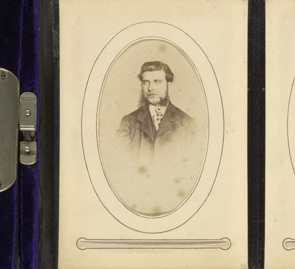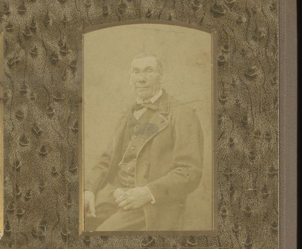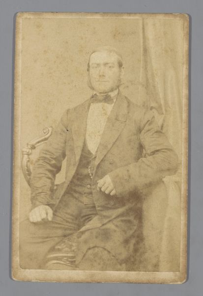 Editor: So, this is "Portrait of an Unknown Man in Costume," a gelatin silver print photograph by Pieter Wilhelmus Roemer, sometime between 1864 and 1900. There’s something melancholy about it... the fading, the slightly blurred image. It feels like a memory. How do you interpret this work? Curator: I see it as a representation of bourgeois identity construction in the late 19th century. The suit, the bow tie – these are symbols of aspiration and social standing, performative elements. Who gets to participate in this visual language of power and respectability and who is excluded? That's a central question for me. Consider also, who took these photographs, and who owned them. Editor: So you're saying it's not just a simple portrait, but it's about… access? Curator: Precisely. Photography was becoming increasingly accessible, but control over its narrative remained largely with the privileged. The very act of commissioning a portrait was a statement. Consider also how portraiture functions within the male gaze; who is represented and how? Do you see an element of conformity in his face? Editor: I do, now that you mention it. He looks like he's trying very hard to fit a mold. So, the "unknown" aspect could be because he's not challenging existing systems, reinforcing social categories... almost complicit? Curator: Exactly! The anonymity allows us to see him less as an individual and more as a representative of a social type – and perhaps even critique it. But is there something to be celebrated too about increased agency for this demographic, as such portraits were inaccessible earlier in history? Editor: I guess it is both restrictive and expressive, representing change. This photograph suddenly has a lot more to say. Thanks! Curator: Indeed. Art provides such opportunity to consider context. I also learned, looking at him with your observation of melancholy.