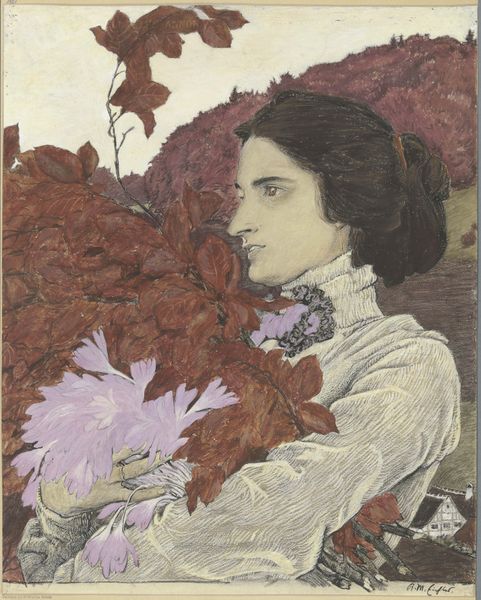 Editor: We're looking at "Roundel Portrait of a Girl," a print by Eugène Grasset. The combination of the girl’s delicate features and the surrounding stylized foliage gives it such a dreamlike quality. What do you see in this piece? Curator: I'm drawn to the piece's engagement with printmaking as a medium and its place in the rise of commercial art. Grasset isn't just creating an image; he’s participating in a broader discussion about the role of art in everyday life and its methods of production. Consider how printmaking democratizes access to art. What does the mass production of images like this suggest about the changing relationship between art, artist, and consumer during the Art Nouveau era? Editor: That's a fascinating perspective. I was really just admiring the aesthetic appeal, but you're making me think about the printmaking process and who this was made for. How does that shift our interpretation of the piece? Curator: Well, look at the stylized floral elements. Art Nouveau took much inspiration from nature, but in an intentionally decorative way, easily reproduced and disseminated widely on everything from wallpaper to books. The artist is less the sole genius and more like a designer navigating an increasingly industrialized world. Editor: So, the value isn’t necessarily in its uniqueness, but in its accessibility and ability to influence design across different areas? Curator: Precisely! It prompts us to consider the labour involved in creating the printing plates, the paper-making, and the overall distribution. It's art operating within a network of production and consumption. What materials would have been readily available and at what cost, do you think? Editor: Thinking about it that way really opens up new avenues for appreciating what Grasset was doing. It’s much more than just a pretty picture; it's a commentary on the evolving landscape of art production and consumption. Curator: Exactly! It’s in understanding how Grasset worked with and within these industrial means, that we can engage with this art form and the era it's portraying.