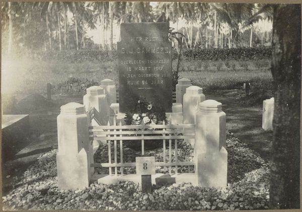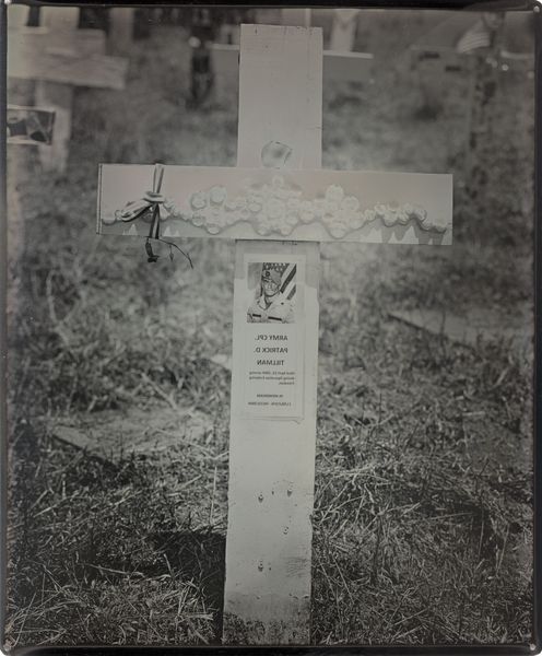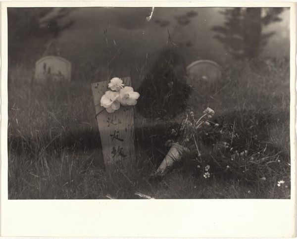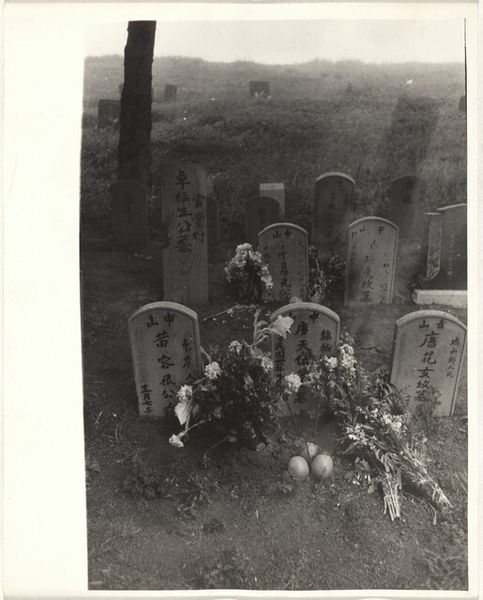 Curator: Robert Frank's "Cemetery--San Francisco," taken in 1956, presents us with a poignant scene in monochrome. What strikes you immediately about it? Editor: A palpable sense of quietude. The soft gradients of gray, the overcast light... it’s subdued, almost hushed. The "Reserved" sign in the foreground is a bleak compositional anchor, juxtaposed against the ornate gravestones in the distance. Curator: Frank often explored societal undercurrents. The cemetery, particularly one in a city as dynamic as San Francisco, provides fertile ground for such examination. The photograph itself possesses a formal rigor. Note how Frank uses the limited depth of field to guide the viewer's eye—blurring the background to keep the "Reserved" sign in sharp focus. Semiotically, that small detail becomes quite charged, doesn’t it? Editor: It does. The mid-1950s in America saw burgeoning consumerism paired with the Cold War anxieties. Is this photo then about anxieties around social mobility, death, or perhaps even the exclusivity of the American Dream? The cemetery, historically, became an interesting landscape reflecting community structures and the values held by different social strata. Curator: Precisely. The choice of a cemetery with, notably, Chinese gravestones complicates the narrative further, acknowledging the marginalized communities often overlooked in the mainstream representation of America at that time. Visually, the repetition of vertical elements—the grass, the wooden sign, the tombstones themselves—create a rhythmic structure that feels both grounded and unsettling. Editor: Right, the picture is fraught with class consciousness, or perhaps an underbelly that reflected a segment of American society and a community. What do you suppose he aims to achieve by incorporating such blunt political discourse, particularly at the apex of so much unrest during this time? Curator: Frank rarely provides definitive answers. The picture creates discourse and opens many more interpretations by emphasizing form and social messaging. Editor: Frank compels us to think critically about what is being “reserved” or not accessible within American society. Curator: The artistry lies in the capacity of a simple composition to provoke introspection regarding life, death, and the silent, often overlooked narratives that exist within any community. Editor: Absolutely. A stark reminder that even in the landscape of eternal rest, societal dynamics persist.