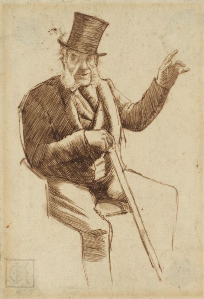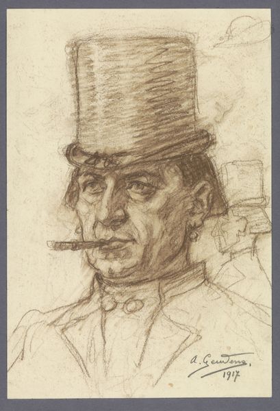 Jan van Essen made this drawing of a man with a top hat and pipe from graphite on paper. The material of graphite may seem simple, but it allows van Essen to skillfully render the texture and weight of the man's suit and hat. You can see a layering effect of graphite smudging, hatching, and creating linear elements. This shows a consciousness of process, and an awareness of the marks the material of graphite leaves behind. The choice of this relatively inexpensive material is also significant. Unlike oil paint, graphite is accessible, widely available, and requires minimal tools. The subject matter of this drawing also ties into wider social issues of class, labor, and consumption. The top hat and pipe were symbols of bourgeois identity in the late 19th and early 20th century. The amount of work involved in the drawing is minimal, but there are details that capture the image of the sitter. The image of a bourgeois man might typically be rendered with a much more luxurious material. Van Essen’s choice to use pencil challenges traditional distinctions between fine art and craft.