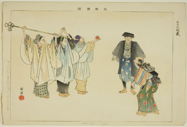 Tsukioka Kôgyo created this woodblock print, Kani Yamabushi, as part of a series documenting No performances. Here, the symbolic weight of the Yamabushi, or mountain ascetic, is palpable. Note the dramatic figure in the center, cloaked in a dark wig and vibrant robes. The Yamabushi embody a fusion of Buddhist and Shinto beliefs, undertaking rigorous practices to gain spiritual power. Their image carries echoes of ancient shamanic traditions, where masks and costumes bridge the human and spirit worlds. Consider, too, the figure on the right and his raised hands: a gesture that appears across cultures in depictions of prayer, supplication, or acceptance. This gesture is a powerful invocation, tapping into a collective memory of spiritual yearning. The Yamabushi, like figures in other traditions, remind us of the cyclical journey of spiritual seeking, their image constantly reborn through art.