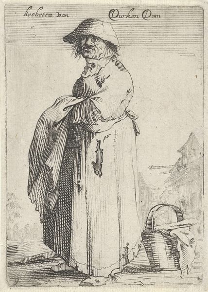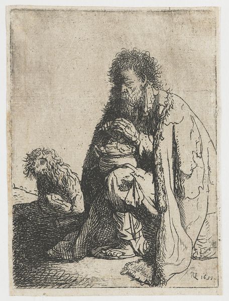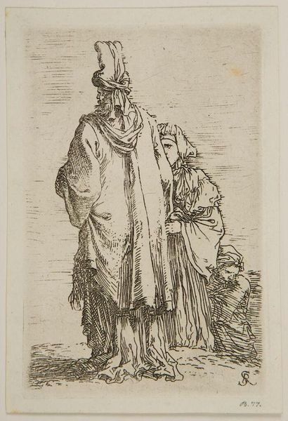 Curator: Here we have Salvator Rosa's "Oriental in Turban, Seen from Behind, with Two Women," created circa 1656 to 1657. This artwork utilizes etching and engraving techniques, featuring ink on paper. Editor: Right, I see it... a lone figure with an impressive turban. The figures around him almost huddle, or cling to him. Gives off an immediate vibe of both protection, and vulnerability... quite affecting for a simple print. Curator: The composition indeed directs our attention to the primary figure, yet the accompanying figures complicate a singular reading. Structurally, Rosa’s employment of line is quite remarkable, considering his subject positions them away from our direct gaze. What significance can you ascertain through this formal arrangement? Editor: Hmmm, perhaps he's exploring themes of authority and anonymity. He presents the ‘oriental’ figure in an almost grand way with that turban, and yet that figure remains unseen, from behind... leaving so much to the imagination. Maybe it's playing with how the Western world exoticizes and reduces different cultures to images or clothes? It feels rather clever. Curator: Your perspective underscores an important socio-historical consideration, as we often grapple with these images removed from their precise historical context. Technically, though, I am compelled to acknowledge the sheer virtuosity embedded within this baroque piece. Look at the varying densities of the cross-hatching to indicate shading, mass and light... Editor: Absolutely. He builds up this whole scene out of almost nothing, hatching a world. Curator: It compels the eye, it really is like building up, as you put it, whole forms, but through these sheer lines! Ultimately this reveals the artwork as both representational, and an independent matrix of pure mark making, the two modes intersecting through this final, etched form. Editor: Thinking about it, maybe he is showing them together as he wants to display two separate aspects. They might each represent feelings he himself has... This man exudes that protection or defense feeling whilst the others express that sense of fragility and worry in our turbulent reality! I may not be entirely correct but still fascinating to theorize!