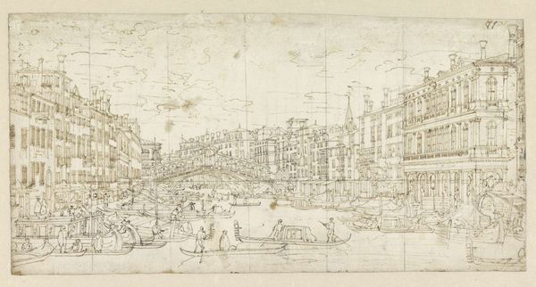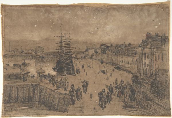 Curator: Welcome. We're looking at James Abbott McNeill Whistler's etching, "Riva, No. 2," created between 1878 and 1880, part of his Venetian series. Editor: Oh, it's delicate, almost like a whisper of Venice. Look at that dreamy haziness. So understated, it could be mistaken for a mere sketch. It makes you want to sigh contentedly. Curator: Indeed. Whistler approached Venice as a tabula rasa. Tourism had reshaped Venice, so he aimed to capture the city beyond popular romantic views, choosing instead its overlooked corners and everyday life. Editor: I can see that. It's definitely not your typical postcard Venice. More grit, less gondola serenade. There's a truth in the lines here, not perfection, and it shows life isn't a polished stage. Curator: His Venetian series, which includes "Riva, No. 2," served as both a means to reclaim artistic independence and a commentary on the commodification of culture, revealing Venice through his uniquely subtle lens. Editor: Ah, the rebel yell! But expressed with a quiet nib, not a shout. Seriously, the light here...It is remarkable for a few strokes, which seems like less is so much more. How did he catch Venice just resting like that? Curator: Whistler employed a technique of selective wiping of ink from the plate, achieving atmospheric effects and tonal subtleties unusual for etchings of the time, which contributes to its sense of immediacy. Editor: That makes perfect sense. You almost feel the dampness in the air and see the gondolas knocking, gently, next to the little crowds of people standing near the front, where I'm at. Curator: His ability to merge acute observation with a reductive approach is quite masterful. It reflects Whistler’s wider aestheticism, which championed “art for art’s sake,” separating it from moral or narrative burdens. Editor: I love how it captures the everyday hustle. No gods or heroes here—just the beauty in ordinary moments. Venice, but normal. Sort of. I wonder if he was just wandering with that plate and acid bottle... Curator: Ultimately, this little print challenges prevailing views on Venice, showing a side of its real identity away from a romantic perception created for and by popular culture. Editor: Looking at "Riva, No. 2", I see Venice peeled back, revealed—gorgeous and a bit imperfect. Cheers to the art of seeing past the glitz and glimmer!