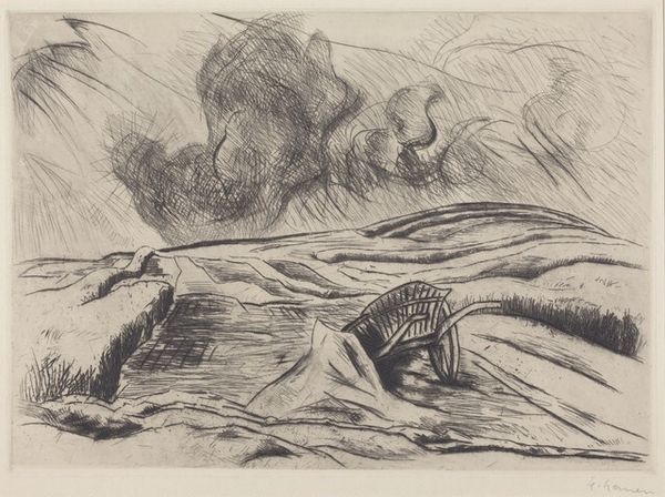 Curator: Today we are examining "Stories in Wilderness – 6", an ink and pen drawing rendered between 1939 and 1940 by Arnold Peter Weisz-Kubínčan. Editor: Immediately, the texture grabs me. There's such intense hatching to describe mass and shadow—the oppressive darkness of the jungle really comes through. It's…unsettling. Curator: The formal strategy of dense line work does establish an unsettling mood, heightening the stark contrast between light and shadow. Look closely, and you’ll see how Kubínčan’s expert handling of ink generates a tangible, almost suffocating density. Editor: And that lone figure sitting atop...whatever that mound is...shooting a gun. Who is he? What’s his story? The colonial overtones are palpable. Here he is, this white figure, violently imposing himself onto an unfamiliar and quite hostile environment. Curator: He might be a surveyor, a hunter, or merely a figure symbolic of intrusion. Note how Kubínčan deliberately positions him above the indigenous creatures—crocodiles and hippos—crafting a visual hierarchy, with the figure’s weapon defining the terms of encounter. Editor: Exactly. This is a very violent encounter. Is this journey of "discovery" merely another excuse for destruction? Consider the date, the late 1930s. With looming war and expanding imperial power, this work speaks volumes about the anxieties of the period. What stories of exploitation are etched within that wilderness? Curator: It's worth observing how the realism of the creatures is contrasted with the almost abstract rendition of the environment around them. This disjunction makes for an oneiric composition. Editor: Precisely, we're pulled into a landscape that exists as a battlefield as much as it does as an imaginative rendering of both an exoticised place, and the tension between those who seek to dominate nature versus the ones living within it. Curator: A compelling interaction between abstraction and realism. Editor: An effective composition using shadow and textural density to expose some harrowing narratives about nature, discovery and ultimately, control.