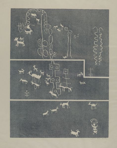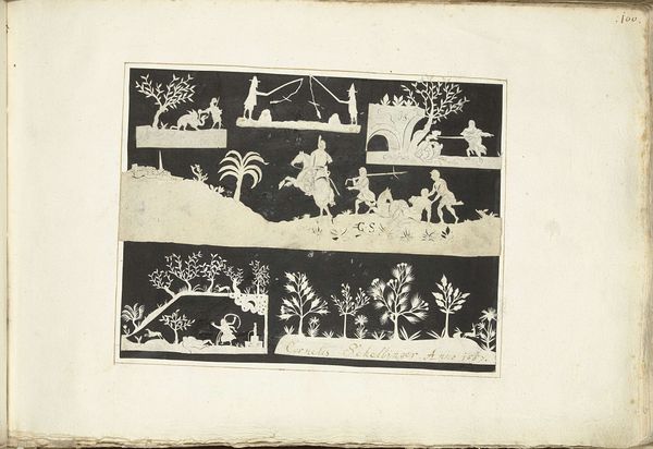 This artwork, titled 'Rennende dieren, figuren en Narcissus', was created by Cornelis Schellinger in the late 17th or early 18th century. The monochromatic piece depicts a series of silhouetted figures, animals, and classical scenes. It reflects a cultural fascination with nature, mythology, and the decorative arts popular during the Baroque era. Schellinger uses the technique of paper cutting to create intricate compositions that offer a glimpse into the aesthetic sensibilities of his time. The decision to include Narcissus points towards a deeper exploration of themes such as self-awareness, vanity, and the human condition. In rendering these themes, there's a distinct absence of societal dynamics such as gender, race, and class; which could signal a departure from traditional narratives, inviting reflection on timeless human experiences through the purity of form and subject matter. The silhouettes convey a sense of drama and motion, drawing us into a world of classical myths and natural wonders.