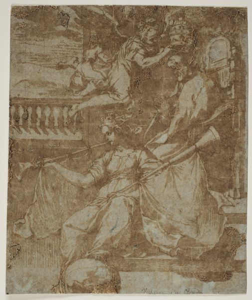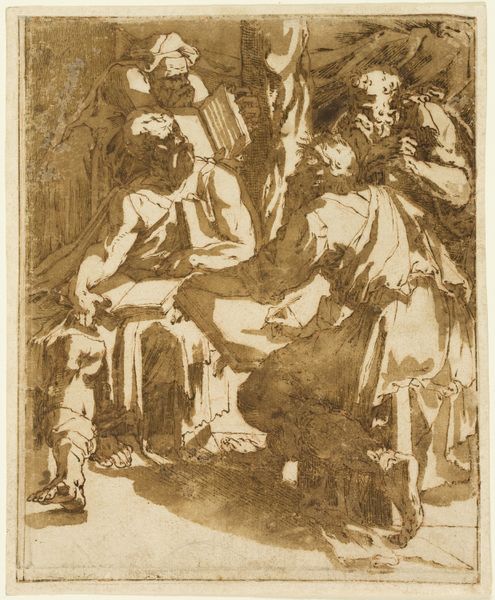Curator: Before us is Nicolas Poussin’s "Allegory of Justice," dating back to somewhere between 1637 and 1639. You can find it here at the Rijksmuseum. Editor: Well, my first thought is that the figures appear so soft and dreamy, as if emerging from a sepia-toned fog. What was the intention of the artist? Curator: As a sketch, its immediacy contrasts strongly with the monumentality Poussin strived for in his paintings. Executed in pen, ink and wash on paper, its means appear quite economical. There’s something about the provisional quality of the drawing that reveals the work’s construction. Editor: Constructed is the right word! I’m sensing a scene of careful consideration unfolding, an ethereal tableau vivant of morality and power. The woman reclining appears weary, while another seems to make an appeal? Curator: Indeed. Given that Poussin lived and worked in Rome, much of his art shows a debt to classical antiquity. It can be felt here. Justice is often depicted with allegorical figures, such as the three figures presented. They symbolize prudence and truth offering wisdom. Editor: Is the bare, simple drawing an attempt to give value to an idealized virtue? Or is that perhaps not the intention here? Curator: Maybe he wants to convey, as material limitations reveal, the impossibility of achieving these things? I’m left considering this interplay between process and result, between high ideals and low means. Editor: That push and pull is fascinating. Justice rendered in ink and paper… It makes you ponder what it really costs, not just to create it, but to enact it. Thank you for elucidating its story and materials! Curator: And thank you for pointing out the pathos of this picture, its sensitive depiction of an abstract ideal.